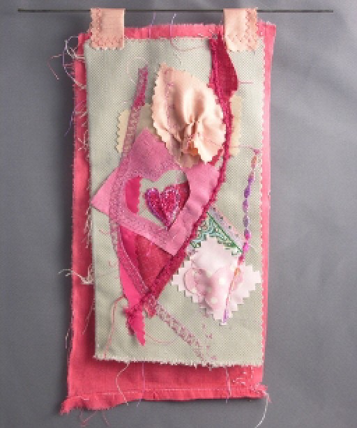 Their flaws are my flaws, imperfect, to be worked around and incorporated. Without the tears, rips and stains, I'd be frozen into immobility, hardly knowing where to start. I'm very grateful to the many friends who've given me the things i've used to make these pieces—Yvanne who gave me piles of 3x4" fabric samples, to Nidhi who gave me her kids’ hand embroidered Indian cotton castoffs that my children then wore to rags, those self-same offspring who found outrageous sparkly magenta fabric somewhere and gave it to me, to Page who has given me luscious kimono scraps she loved and never used, to Posy who took me at my word and gathered bits of fabric and snips of yarn no more than an inch or two, even my spouse, who, bowing to wifely pressure switched to 100% cotton pants (even though they wear out faster)...all of these people, and their generosity, have contributed to these little wall hangings.