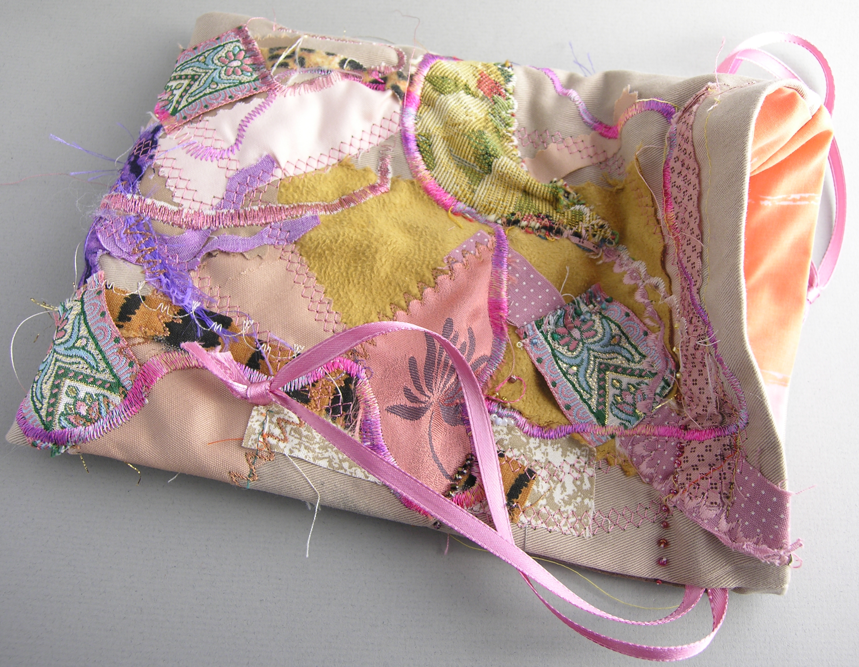 The base fabric is an old pair of cotton pants in tan, which gave me the starting color. Some of the scraps were left over from the mini-bags I made at xmas (which in turn were scraps from Yvanne, or the kids’ Halloween tiger costume....) I was particularly happy with how well the smocking stitch (which is my very favoritist special-purpose) worked. The tapestry fabric is a scrap from my friend Page; the little ribbons are cutoffs from Firefly Embroideries (Chris Reilly); and the coral colored silk scraps I begged for in Viet Nam.