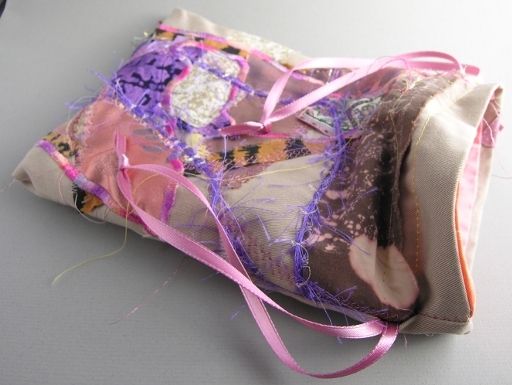 cotton, silk, synthetics, ribbon, beads, including a hand-dishcharged scrap. 6-1/4 x 9" Manufactured 06jan09.
