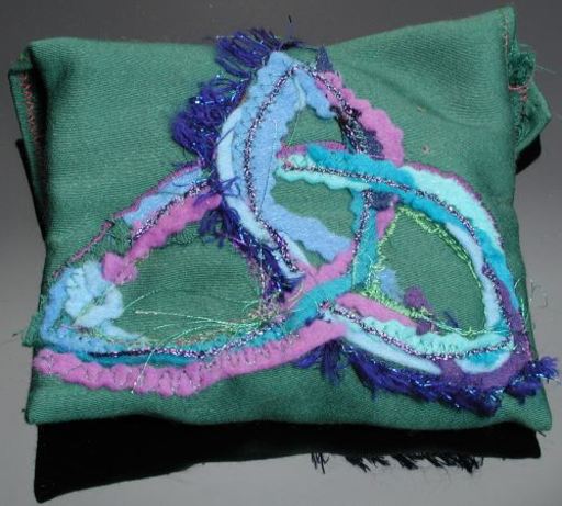 ...even for me. This was, I believe the first of the series, and I experimented with machine couching, using extremely fuzzy blue yarn (with blue sparkles), some sparkly purple stuff intended for canvas works and, because I hate wasting anything, shreds of metallic green thread the machine wouldn't actually pass through the needles.