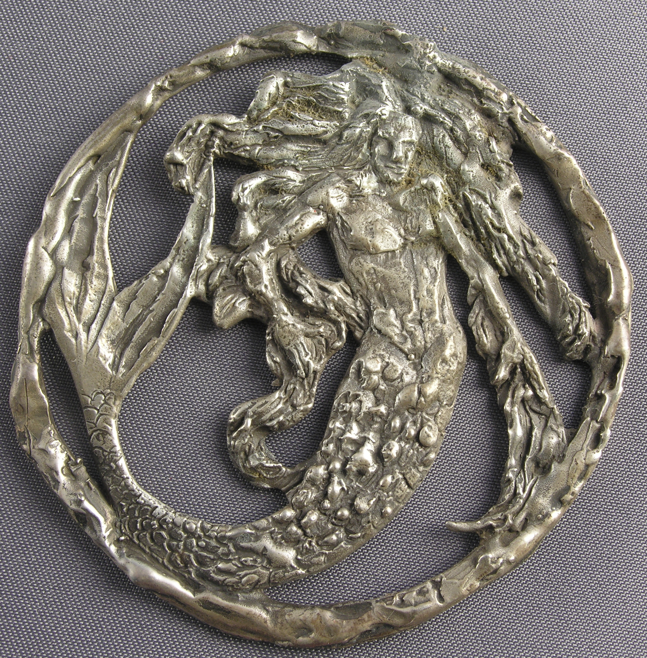 I loved the bronze dragon pendant I put into my very first kumi necklace and it was the basis for a similar design, this time of a merman. However, as you can see comparing the two, the merman is much coarser than the dragon; this may have been one reason I was willing to give it away[1] to my friend Page, who no doubt extravagantly admired it. (Or I may have made it for her: I don't remember. I'm just profoundly grateful she's held on to it all these years, and asked me to photograph it.)