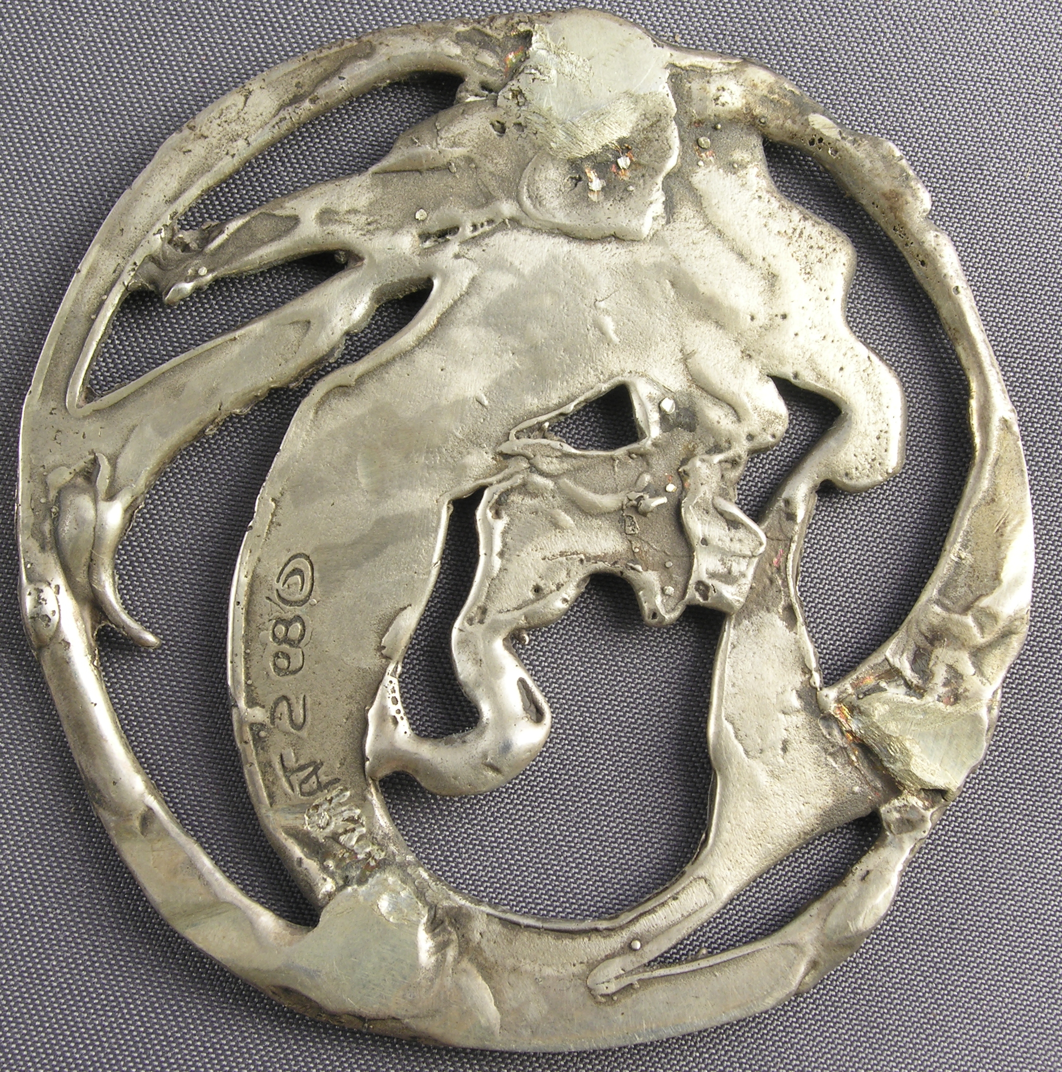 As I recall I made three cast pieces for the class (a fourth, of a bead, I think I made at my second batch of metalworking classes, at Henry Ford Community College.) One was a little cast rejiquar, which I gave to the wizard, and was subsequently stolen from its place of honor as a monitor guardian where he worked. (Mebbe I should've cast it copper or brass, instead of silver...) A second was a crudely made auto, which I intended to incorporate into a piece about all the wrecked cars which abounded in our neighborhood. (This has subsequently been incorporated into yet another unfinished piece from my third round of metals classes—if I ever get the hinges done, I'll post this piece...)