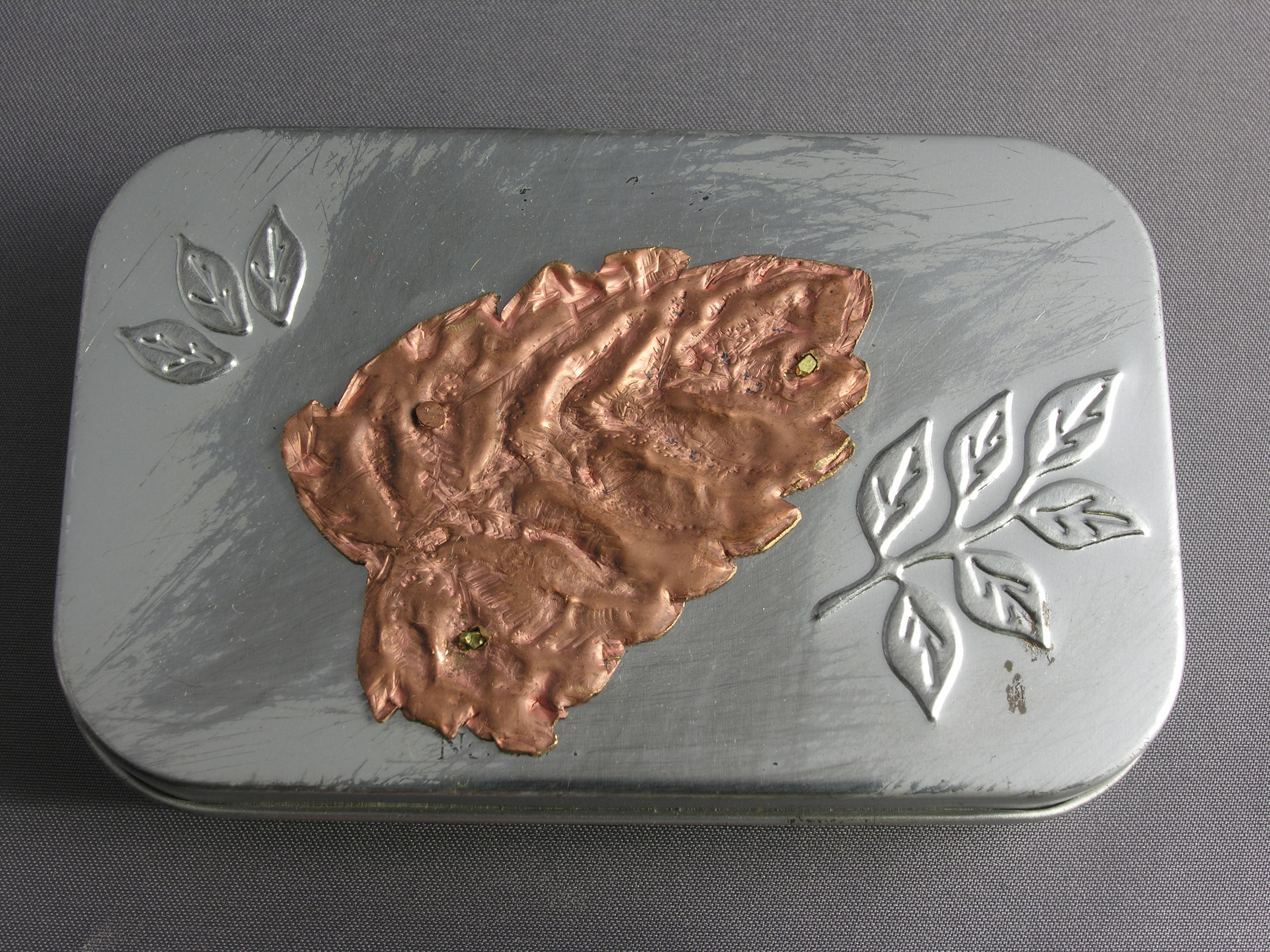 Altered mejiers mint tin (standard size of roughly 2-1/2 x3x 3/4”). The leaf is probably made of some bronze weather stripping scavenged from our old house. Repoussed, rivetted. 1st half of 2008 (I think...)
