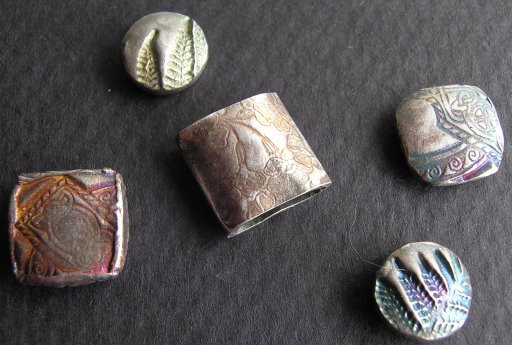 She herself had managed some quite beautiful effects by multiple dippings of various pmc pieces in a liver of sulpher solution (alternating with hot water to speed the reaction.) Silver, as I've mentioned before , forms oxides, that depending upon their size, span the rainbow in terms of color (silver sulphide, the black stuff, on the other hand, only comes in one color, but is extraordinarily stable.)