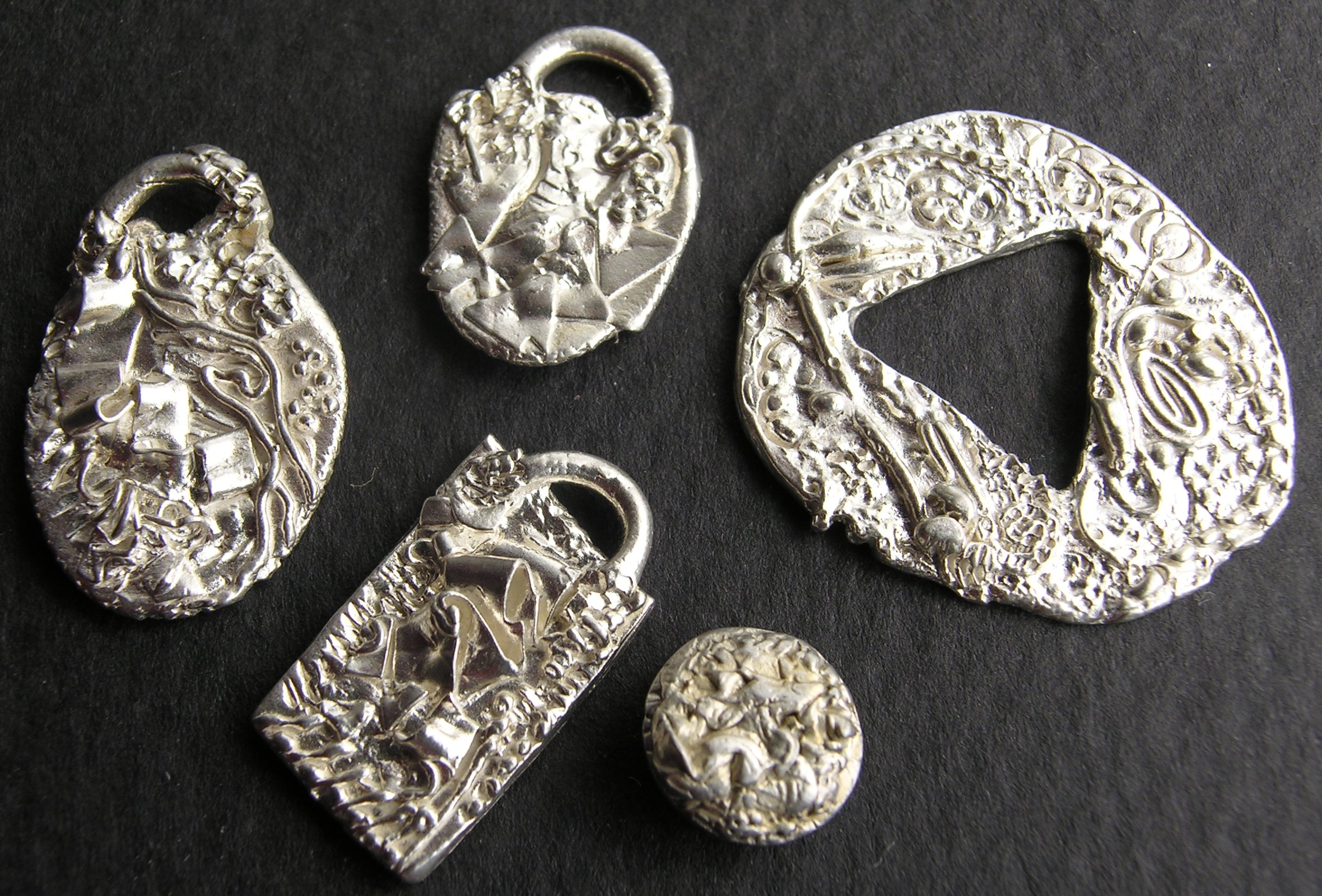 So that may be why, even with the allure of marvelous texture, that I didn't do much with pmc. (There was also, at that time, a raging debate that firing pmc in your kiln was deposit silver on it, which would then subsequently affect and discolor some soft glasses.) Time passed; I took another workshop with a far more limited, but successful approach; and pmc+, which only needs to be fired to 1200 deg F, became more common. —My kiln will go up to 1650, but it takes it a long time, it leaks heat (the bricks stop fitting properly when it's that hot) and I just got the sense that I was wasting a lot of electricity and element life to no good purpose.