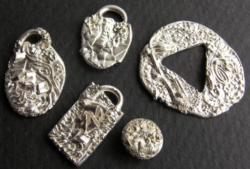 Ivy Woodrose's pieces are successful for a variety of reasons, but one of them is the way in which the artist contrasts very clean traditional metalworking technique with the fabulous texture that pmc provides. There is no question, looking at this woman's work, that her mastery of standard metal technique is first-rate. There is also no question, looking at my primitive efforts here, that mine isn't.