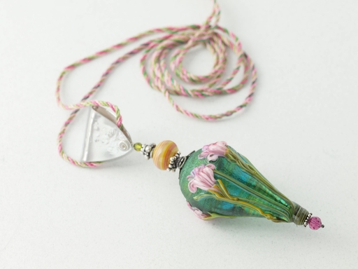 Hollow striped vessel with floral trailing, sterling bail riveted shut with flattened corrugated bead, and twisted cotton (some ombre) cord, accented with stripey mini-hollows. Assembled 2012