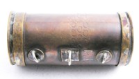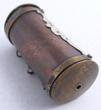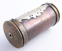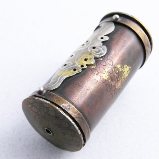 I made this bead because the textured copper sheet, which I rescued out of the class scrap box, interested me. I also took it as an opportunity to practice my riveting—there are five tube rivets (made with varying levels of success) on this piece. The top decoration is sterling, and was supposed to be fancy cut. It was while making this bead and others that I discovered I could really use a set of tiny needle files. The two balls of silver at each end of the bead are to cover up solder joins on the brass wraps, which are purely decorative elements.