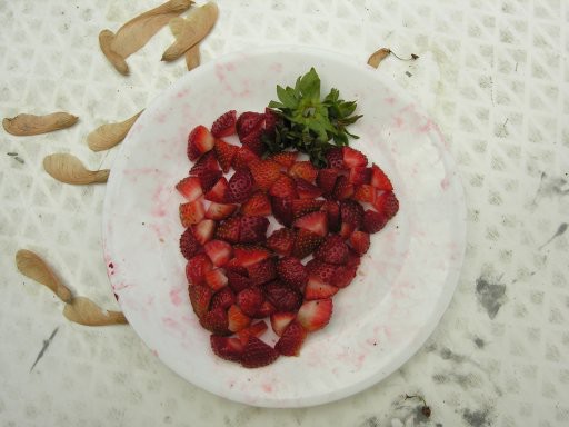 I noticed on some art blog that the guy was doing Friday kid-art blogging, which I thought delightful. Well, his kid was quite a bit younger than mine, who can now measure those bday candles in double digits, but as it happens my offspring do occasionally sprout artistic tendancies, as with this meta-strawberry: