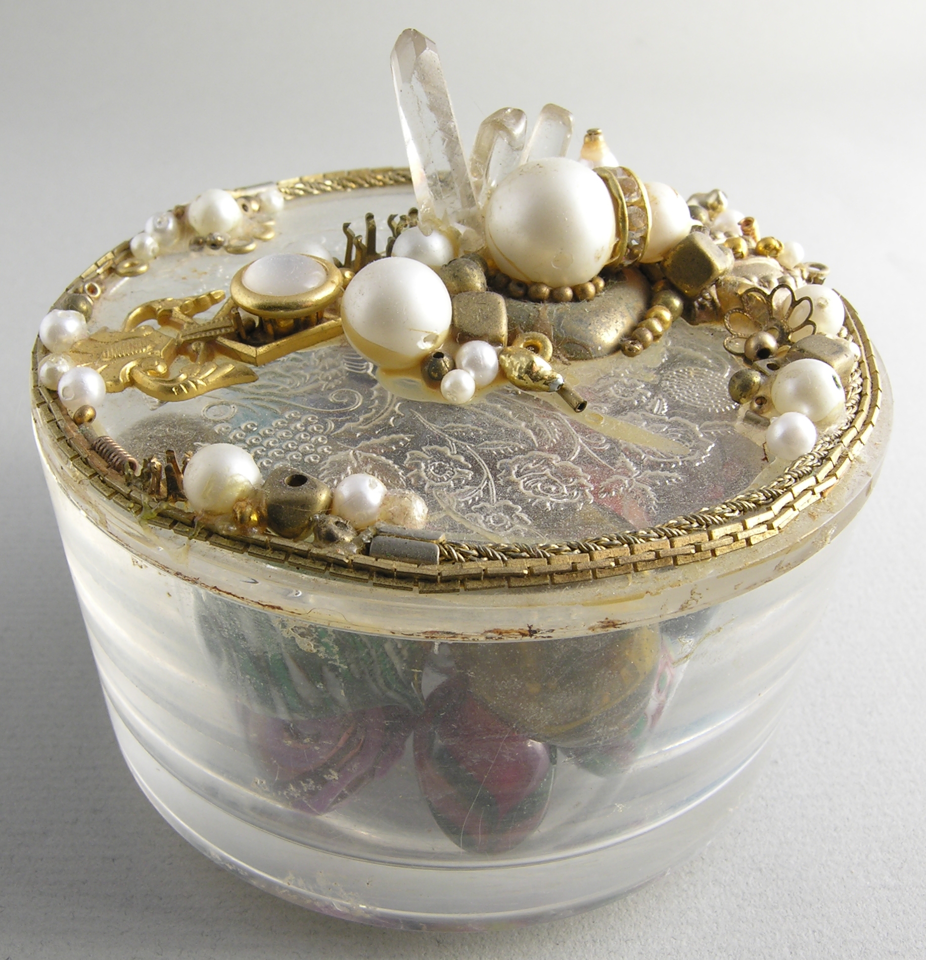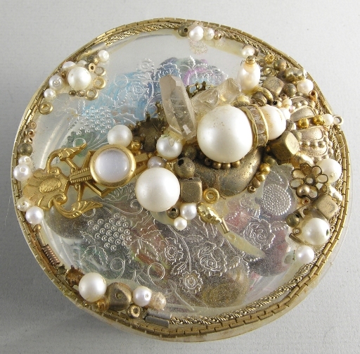 I can't say how many years ago I epoxied a bunch of fake pearls, brass and basemetal findings, along with a coupl of pseudo crystals, but it though it was after found items had become fairly common in jewelry, it was before this current fashion of floral assemblages and other vintage jewelry I'm currently seeing in etsy really took off.