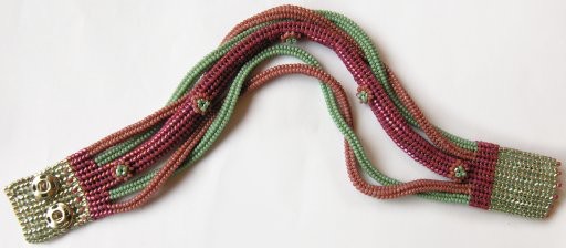Margaret has taken up seed bead work relatively recently, and likes to take classes of projects; then she often makes variations, particularly in color. This bracelet is of a type that's been kicking around for awhile, though the most popular version is usally in a very graphic black and white combination; the square sided strands are, in my opinion, a particularly handsome variation of the bead-stitched tube. With the addition of the flowers and the subdued earth-tone color combination (not to mention the matte surfaces) this lends an organic quality to the piece.
