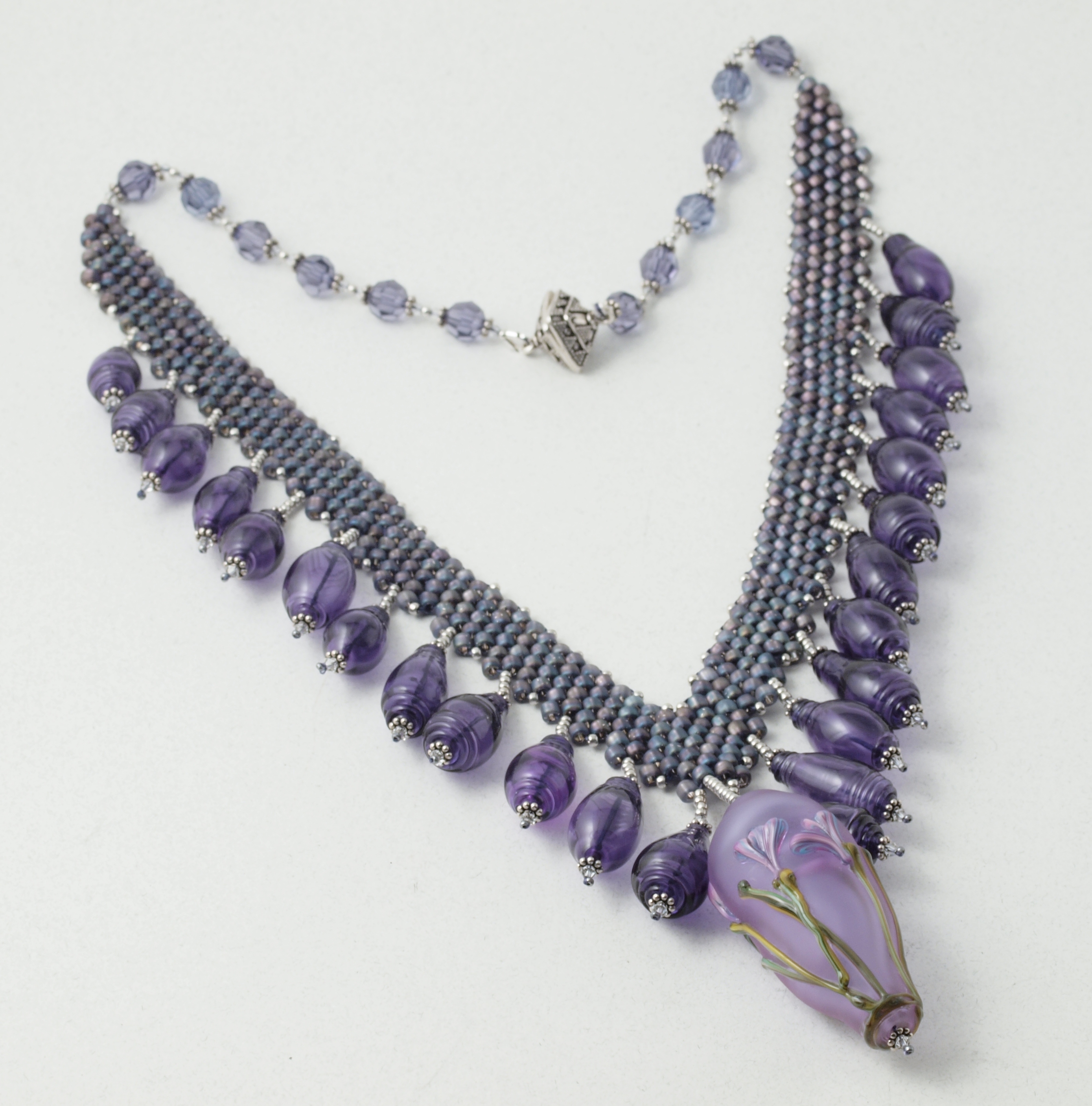 Cindi, despite the fact that I was working from swatches of peyote, went through several iterations of seed bead colors; also adjusted the thickness of the band; and so on. Then she decided the focal didn't match: her objection was that the vessel was of a redder glass than the plain drops, and of course she's absolutely correct, but since there is that much variation in the bead fabric—in fact, that's one of the things I really like about the piece—I didn't have a problem with it particularly since the floral cane runs the gamut (and then some.)