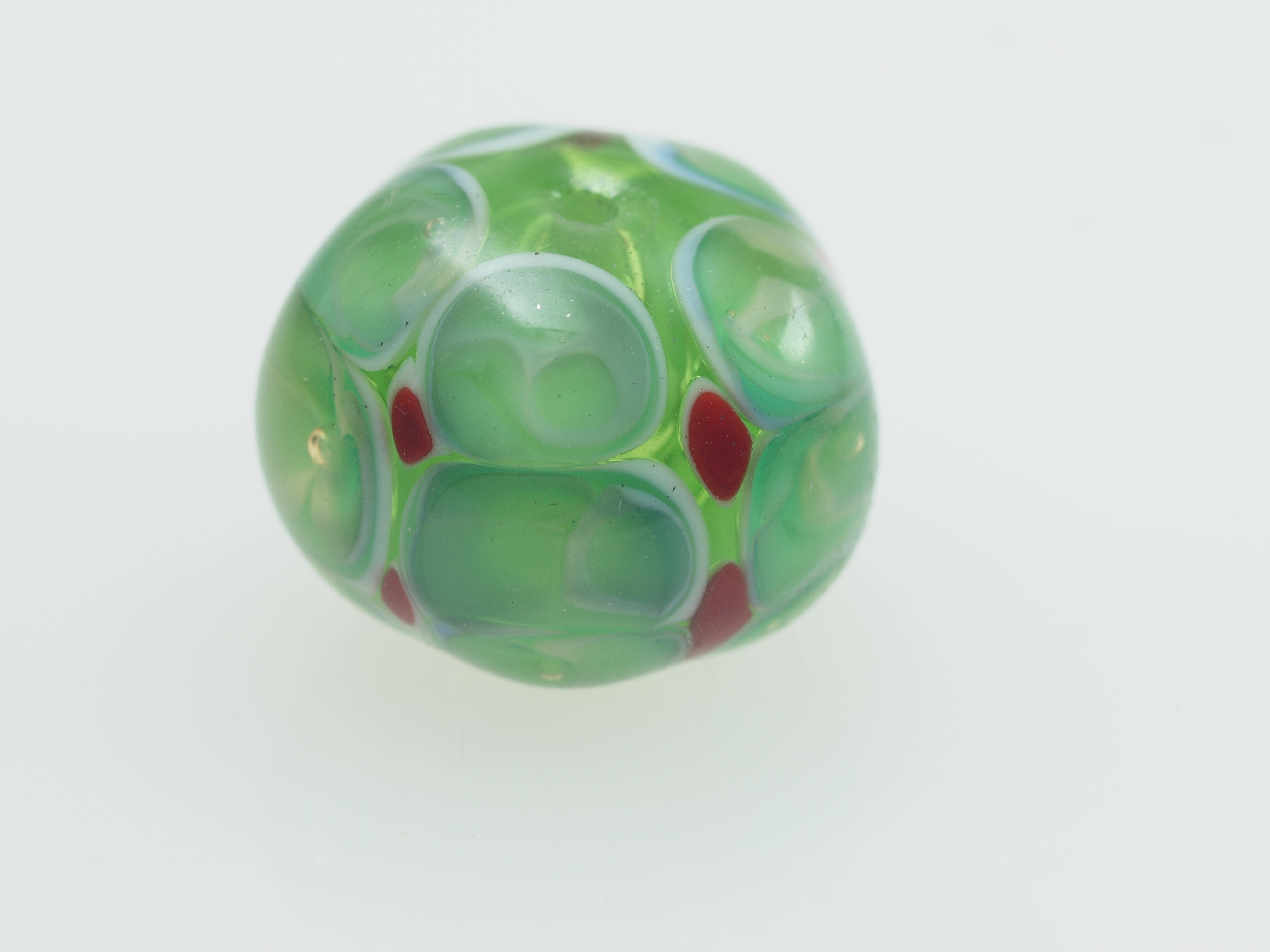 This bead is, to be honest, kind of bland and boring, but I didn't have time to do something better, and I didn't have anything else remotely in the correct colour scheme (I made this bead specifically for our santa swap.) It's hollow, but a thick hollow, with layered dots in green and white (& red) on a transparent base. Plunging the dots not only puts a pretty bubble, it also pushes the dot down, making it somewhat easier to make a less lumpy bead. (I have been thinking about these beads for a very long time.) Really, this bead's beiggest problem was that it needed a more contrasty (i.e. darker) colour for the base dot—not only to get the flowers to show better, but also to balance the red. C'est la vie, try again next time.