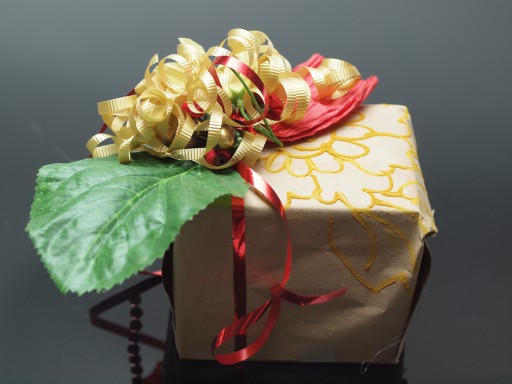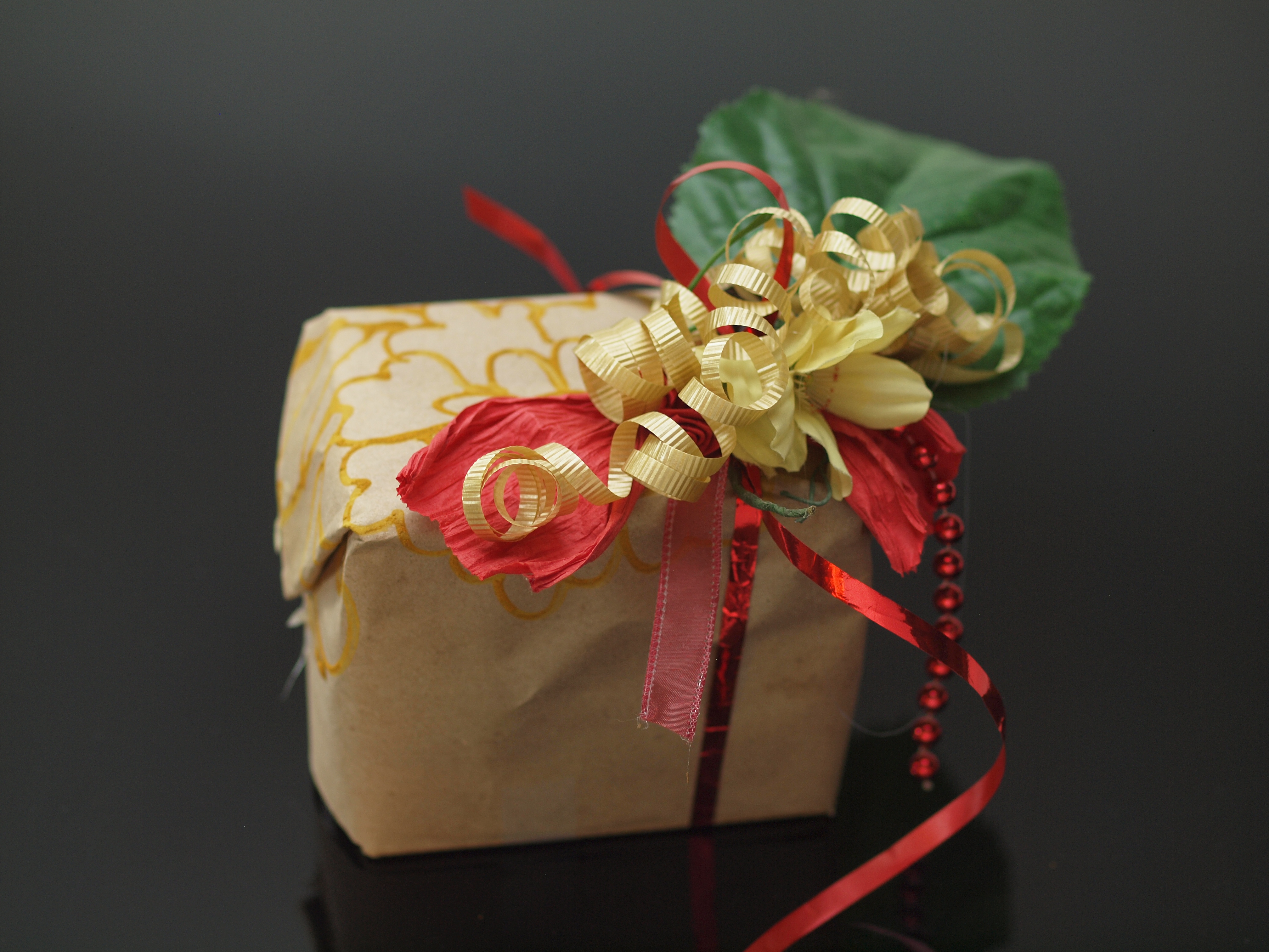 Since the bead went into a fairly small box, the paper, which measured perhaps 12" square, was (mostly) big enough to wrap the box (I left the bottom uncovered, since the box was the same cardboard-brown colour.) To help tie the turmeric in I added a yellow flower & ribbon. All in all, a not-entirely-successful wrap job to cover a not-entirely-successful bead, but ‘done-by-deadline’ is sometimes more important than perfect.