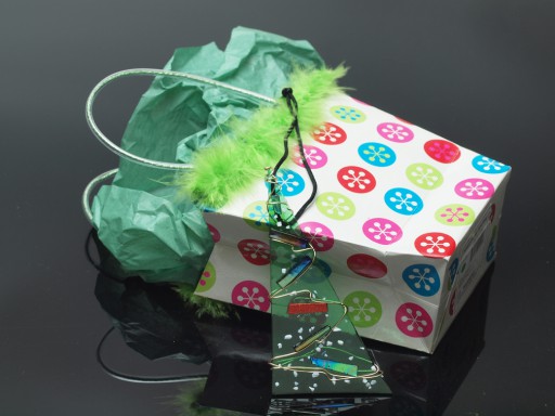 I'm a great lover of lime green, which I think makes a wonderful accent for emerald, red, fuchsia or turquoise, so you can see why this colour combo immediately caught my eye. The ornament is made with a base glass that has a subtle sparkle that my photography probably entirely failed to capture, accented with dichro tack-fused—super-crisp—on & wirewrapped to suggest a garland.