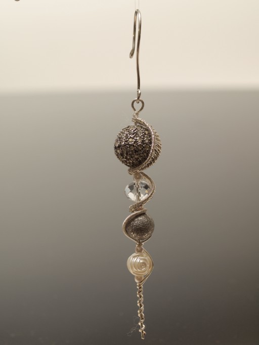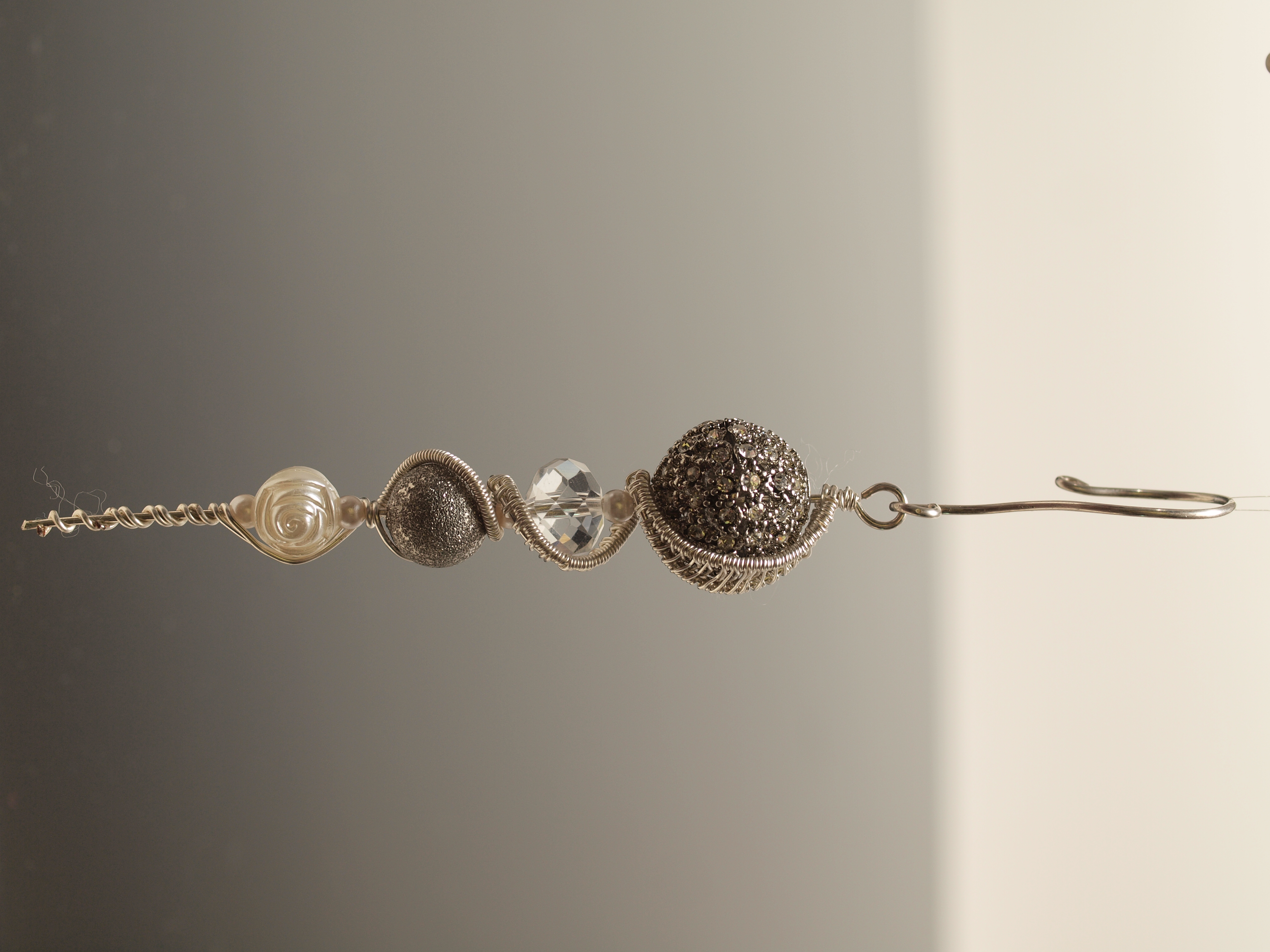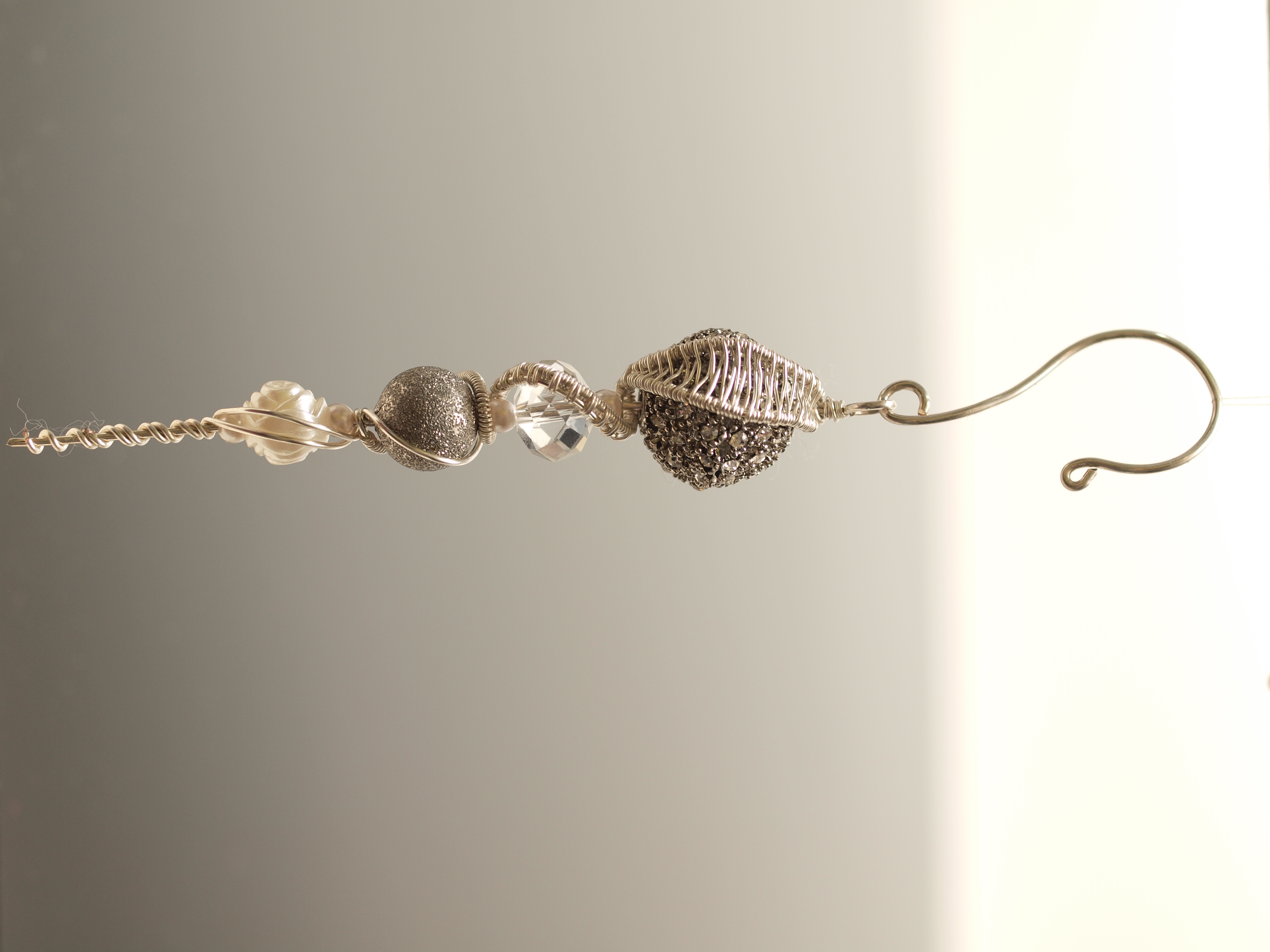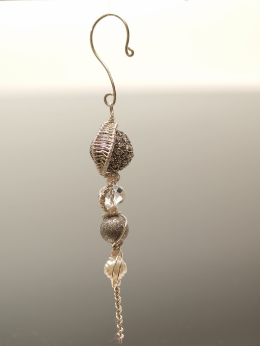 Wire wrapped holiday ornament. Silver (coloured) wire, assorted beads; beaded portion (dangle): 4”; 5.5” overall including hanger. 2019, Dawn C. photographed 21jan2020, zuiko macro/E620