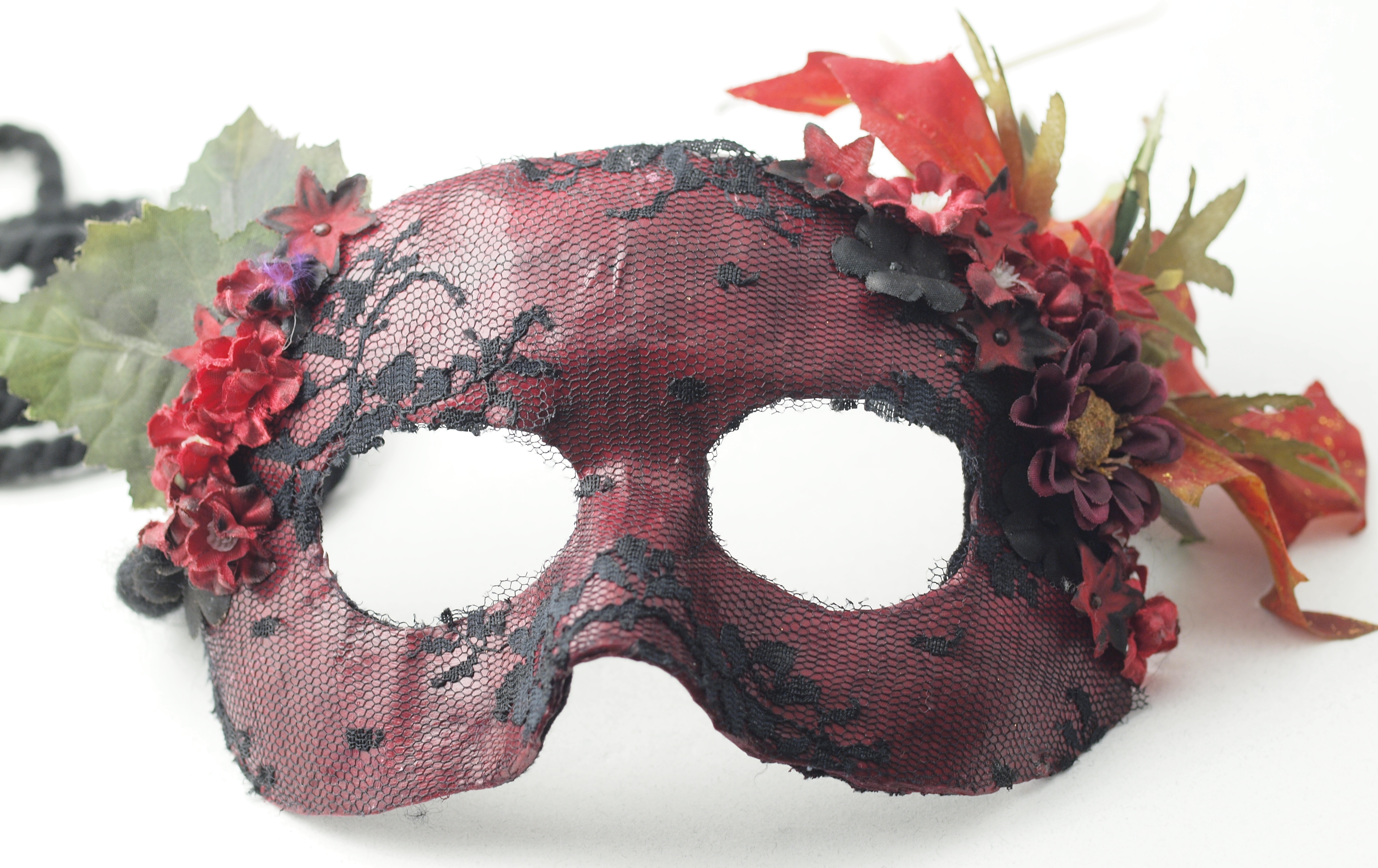 UPDATE: so, after telling Frances about this post, she explained that, yes, she actually made the mask, shaping it to her face, using wheat paste, paper, and then glue (forget what kind, but guessing something in the aliphatic/white glue family). She painted the red color using acrylic paint, then adhered the lace with Aileen's tacky glue. She did indeed also color some of the flowers, using India ink (iirc); and then dried the whole business in the oven. Alas, she turned the oven to broil instead of off, with some predictable results, which she characterized as ‘crispy’. However, it all came together wonderfully, and the cooked bits, I'm guessing will provide some extra juicy narrative as well:)