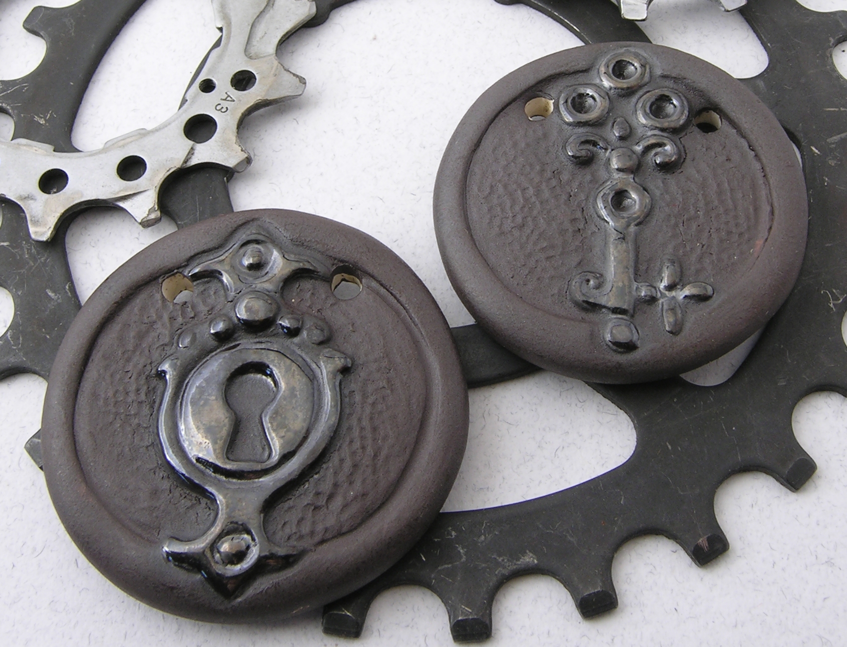 Melanie Brooks of Earthenwood has been making really cool stuff for a very long time. My latest acquisition is this wonderful pair of pendants, part of her steampunk line, featuring an antique key and keyhole. Our current house has some wonderful escutcheons, though the matching skeleton keys have long since been lost or replaced. However, I was lucky enough to grow up in a similiar style of house as a child—the Dutch colonial I grew up in Highland Park was built in 1918, and this place in ’24—and when I was small my parents still had at least one door that opened with an old-fashioned key, as shown here.