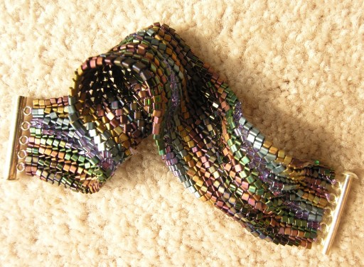 Ndbele (and I prefer this term, to honor the people that originated the technique) is stitched with pairs of beads, with the thread path such that they set at slight angles to each other, producing a wonderfully drapable fabric. In combination with the beads themselves, which are triangular in cross-section (thus angular) and the subtle color pattern running throughout the piece (it zigzags along the length of the bracelet) it's easy to see that this work is a study in the acute angles that permeate it on no less than three levels. (And you thought artspeak couldn't be applied to beads. Ha!)