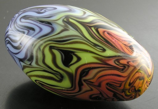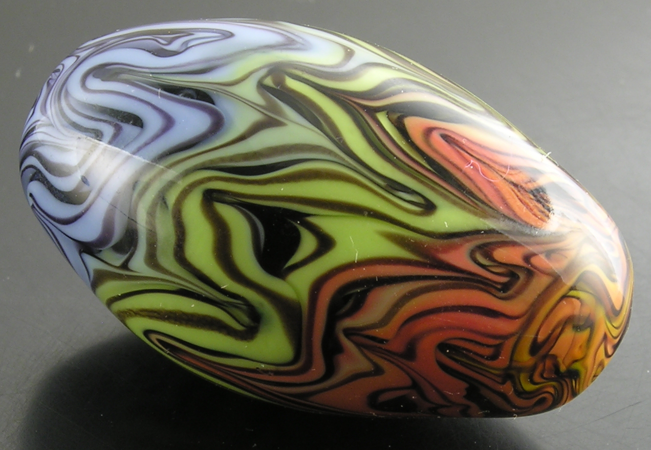 I thought Rita might get a kick out of seeing this variation on her technique—and she did, so much she offered to trade. I wanted to lay my hands on one of Rita's own shard lentils for a long time, and on one of her tricolored coral/lime/purple raked lovelies for even longer, so it was a hard choice, but in the end, I went with the older style.