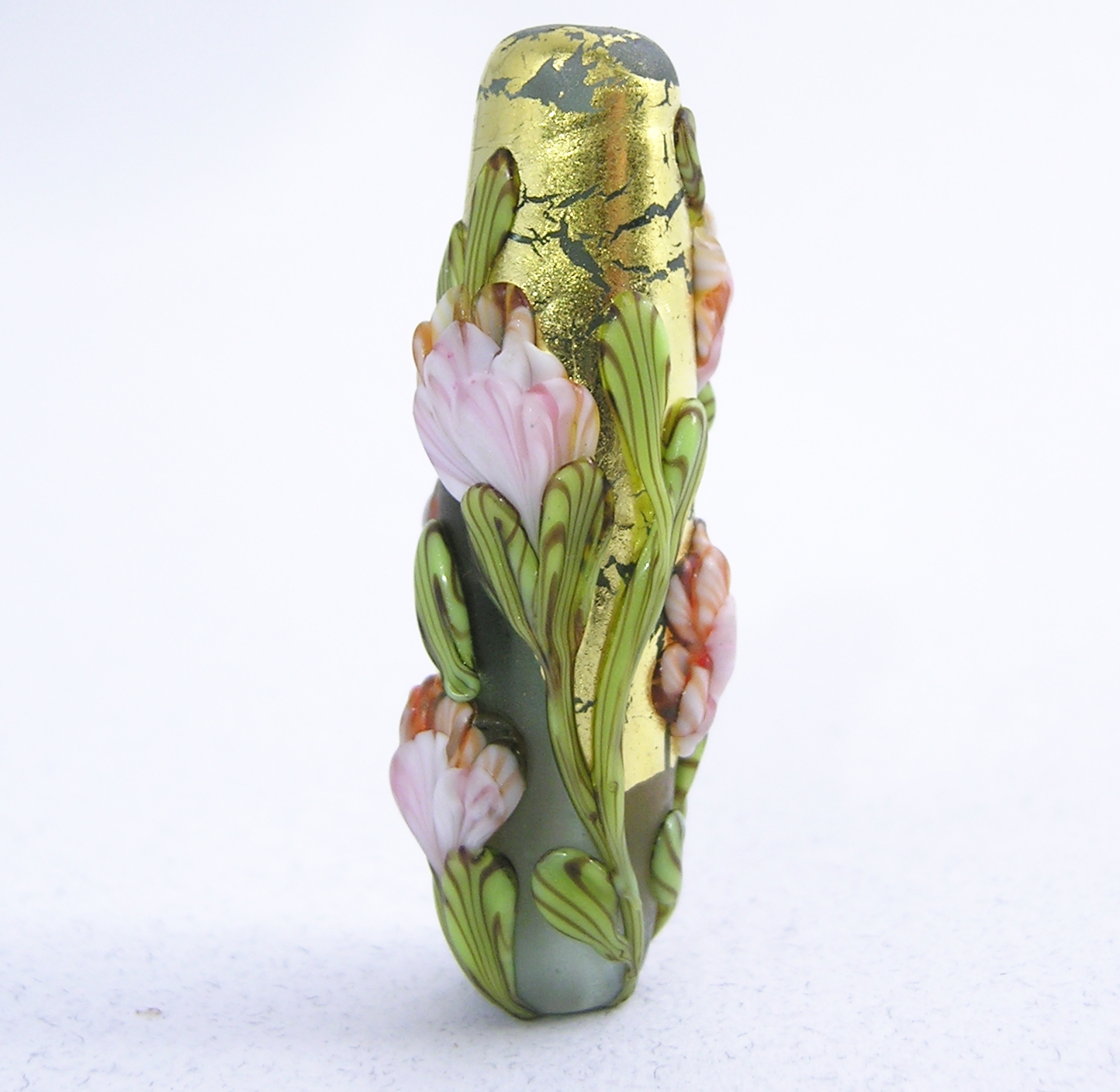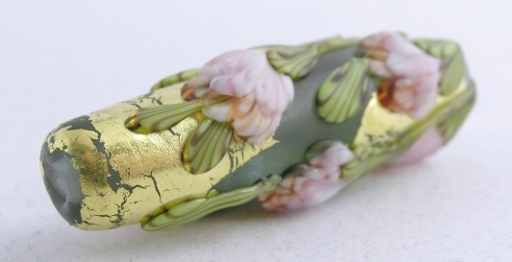 Both Anita and I enjoy making florals, but our goals are just a bit different. For example, I like my leaf cane to be subtly striped; whereas she prefers bold, graphic stripes, as you see in the brown contrasting with the pea green here. In that way, she takes after Kim Fields, whom I believe she cited as an influence. I think it's fair to say that for her, like me, Kristin Frantzen Orr is also an influence: note the two colors of floral cane, darker in the back, and lighter in front, in a floral shape that Orr often uses in her beads.