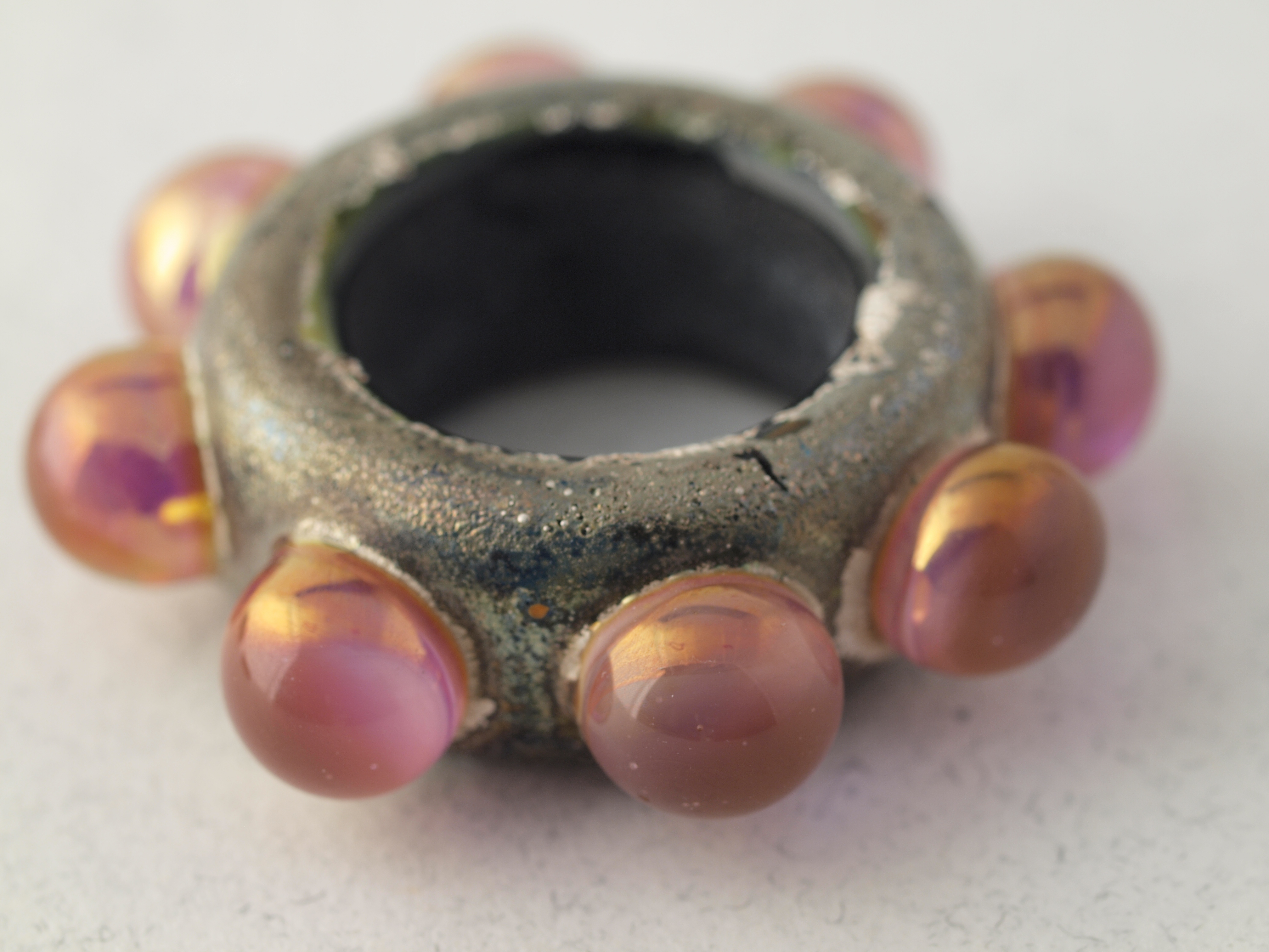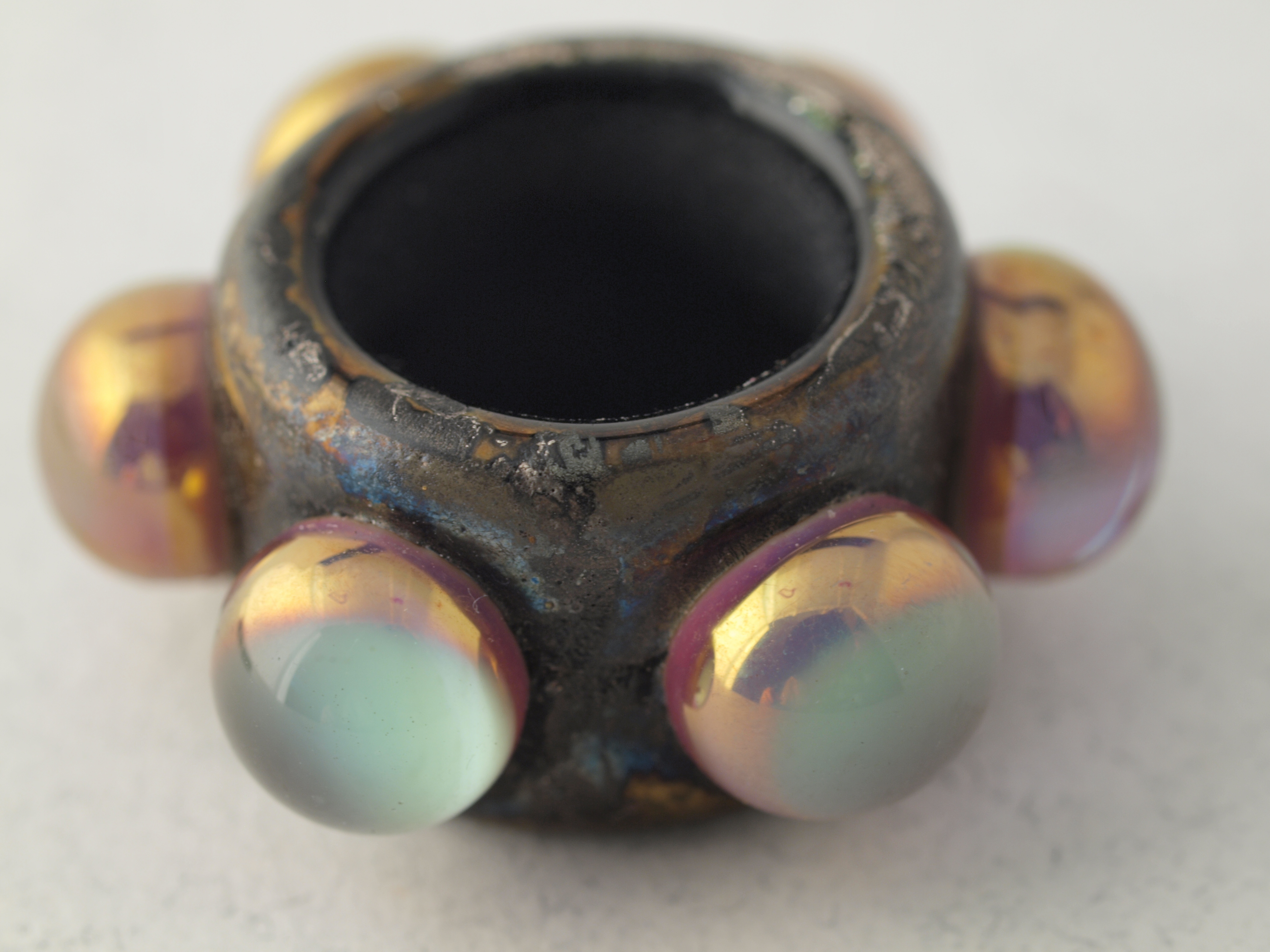 Ona told me this was probably one of her earlier efforts, with more than a little serendipity happening in its creation. For example, the dots have a slight cushion or bun shape she finds particularly appealing. She felt the initial gold fuming was too much, so she burnt some of the gold back off again. The rough surface on the black base glass comes from silver leaf.