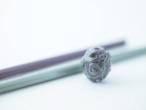 Though Frances was somewhat frustrated with it, I think this is a nice example of ‘simple idea, executed well’. Note, for example, that the bead stands on its own. In fact, it was so stable I felt completely comfortable styling it with glass rods in the colors used to make it.
