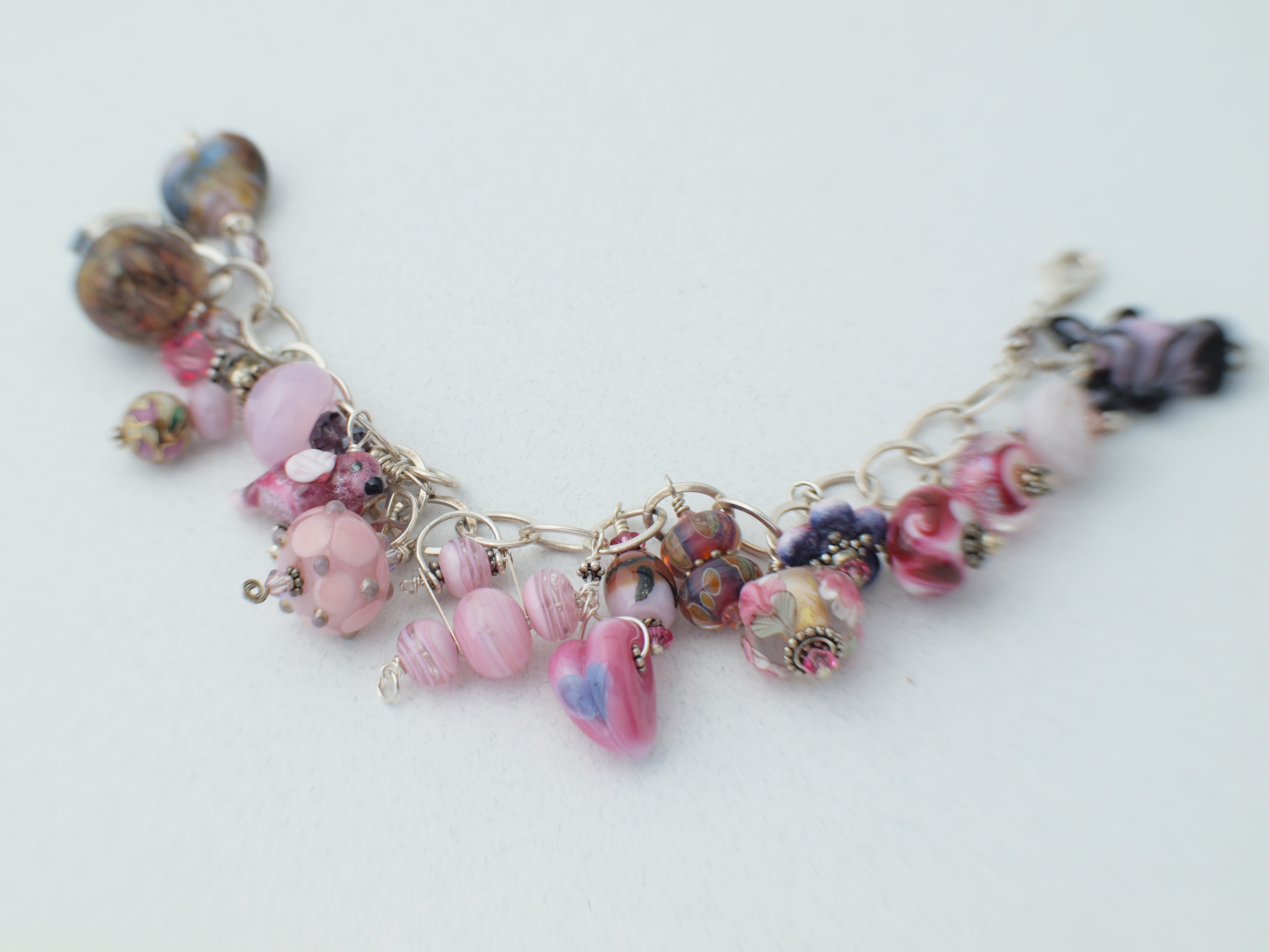pink spacerbar bracelet. My contributions are the dangles 4th, 6th and 8th from the left, and I'm particularly pleased with them, especially the spacerbar one in the center—and yes, I made the stripey pink mini-hollows just for this project, as well as the bird. “Completed” July 2013. Sterling, lampwork, crystal. Photographed 13apr14.