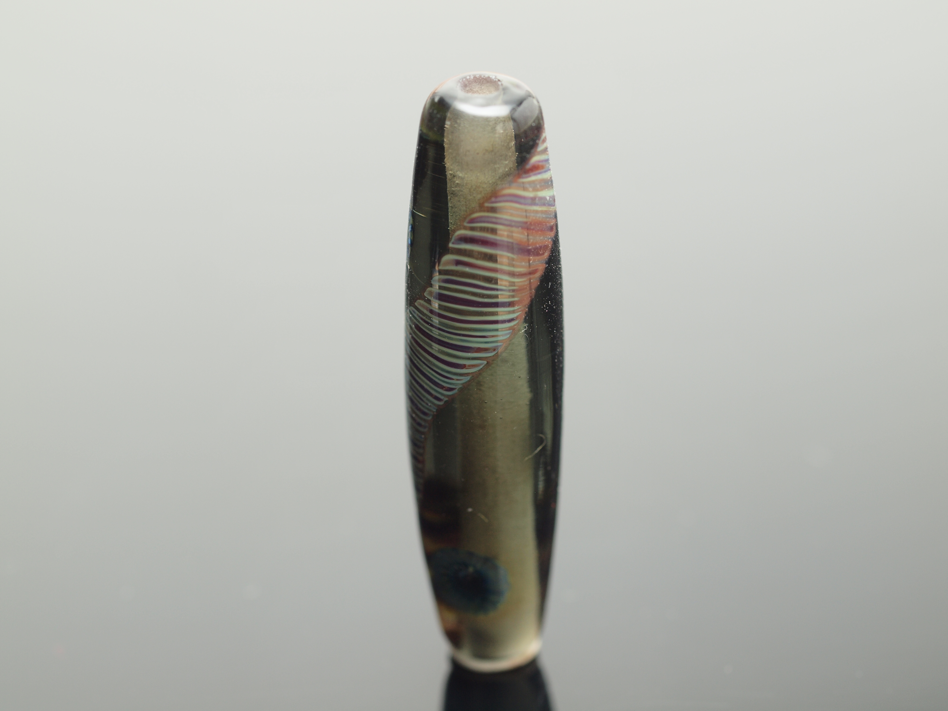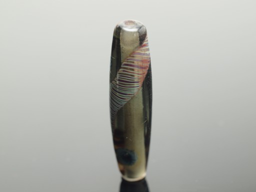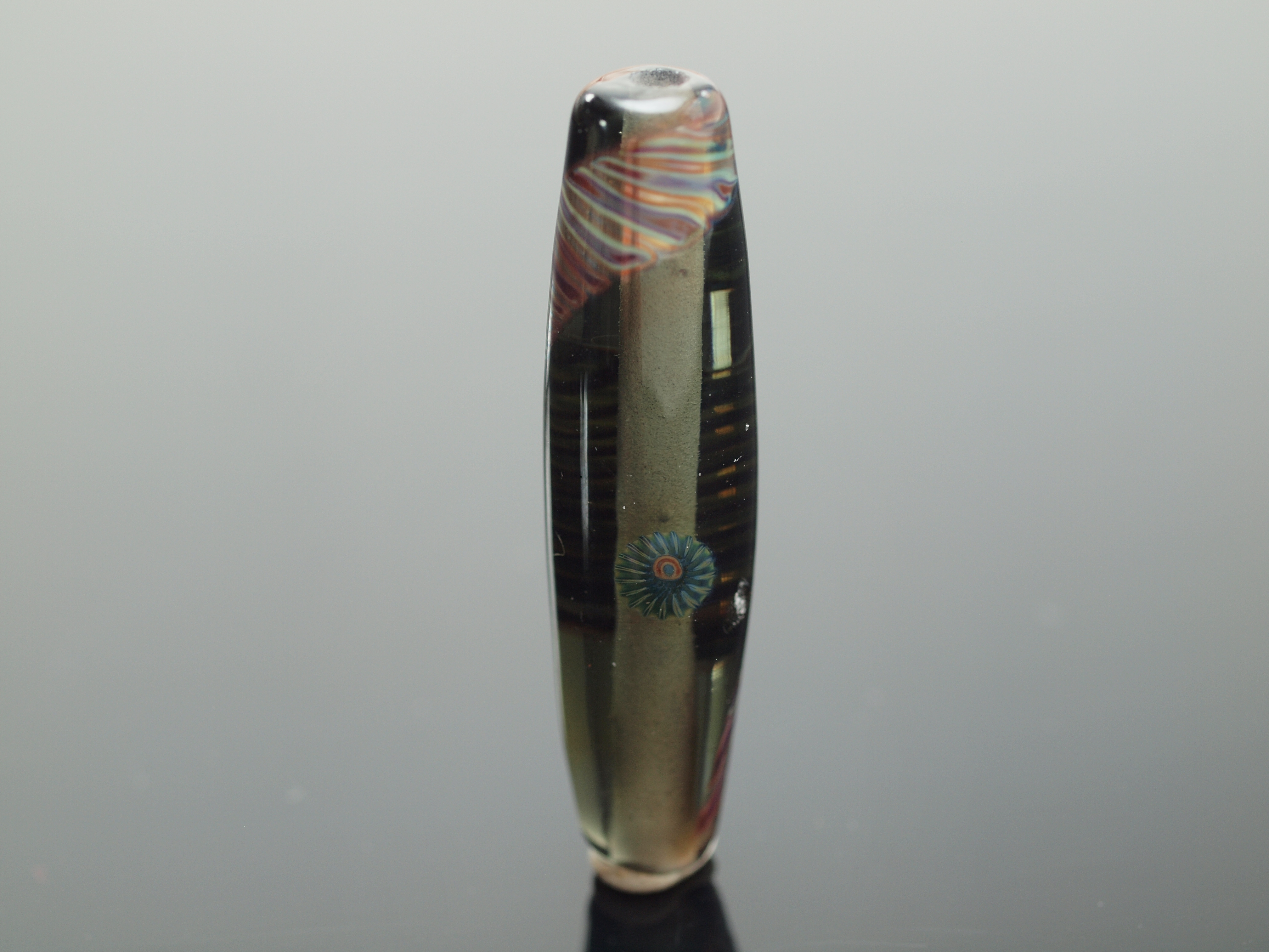 The thing is, since the background the bead is sitting is rigid, I have to shoot at an angle in order to avoid the dreaded line where the black plexi meets the white wall. So the millifiore, especially in the second photo, doesn't show up very well. Nevertheless, I think you get some sense of what this artist is attempting to achieve.