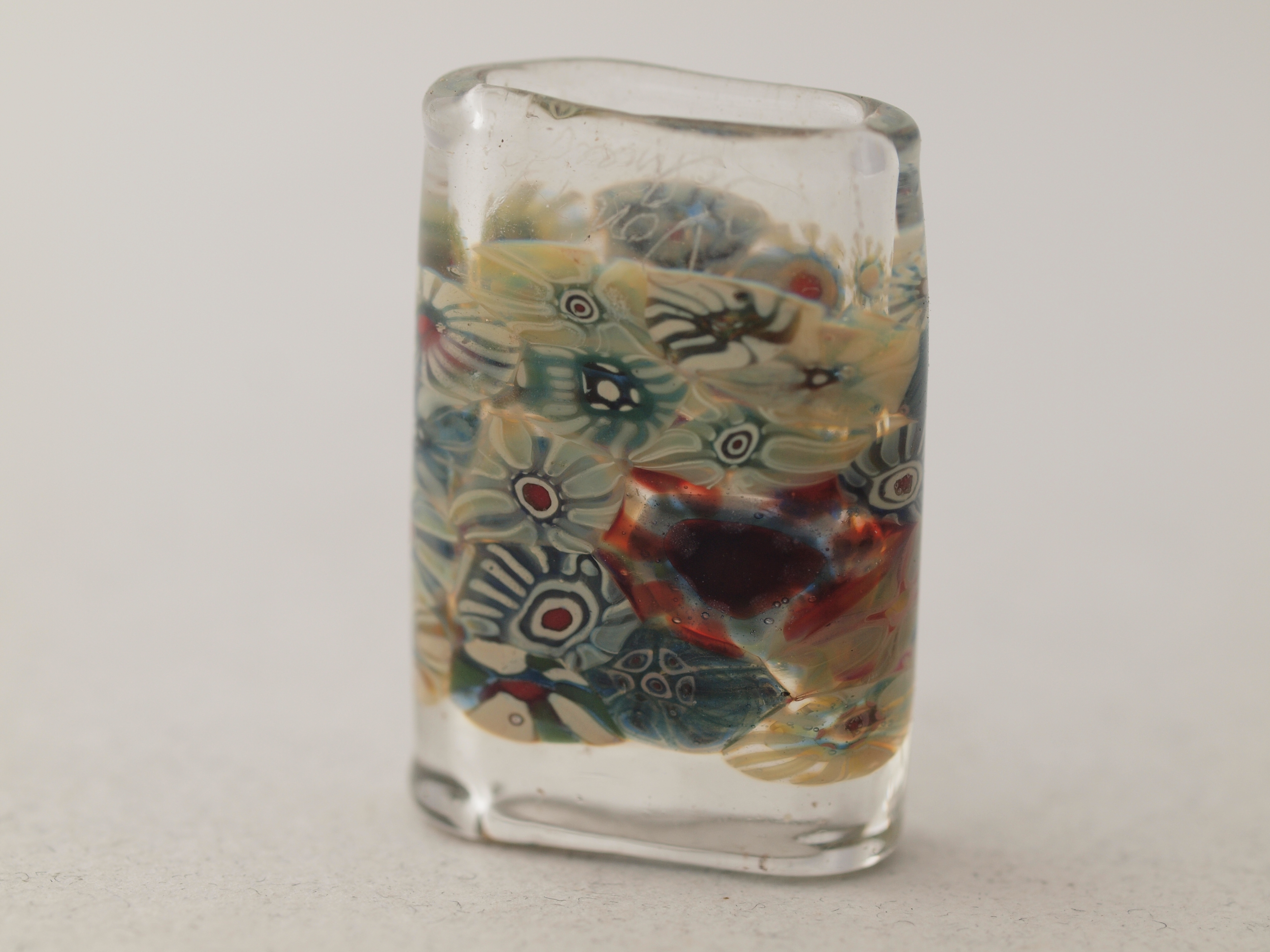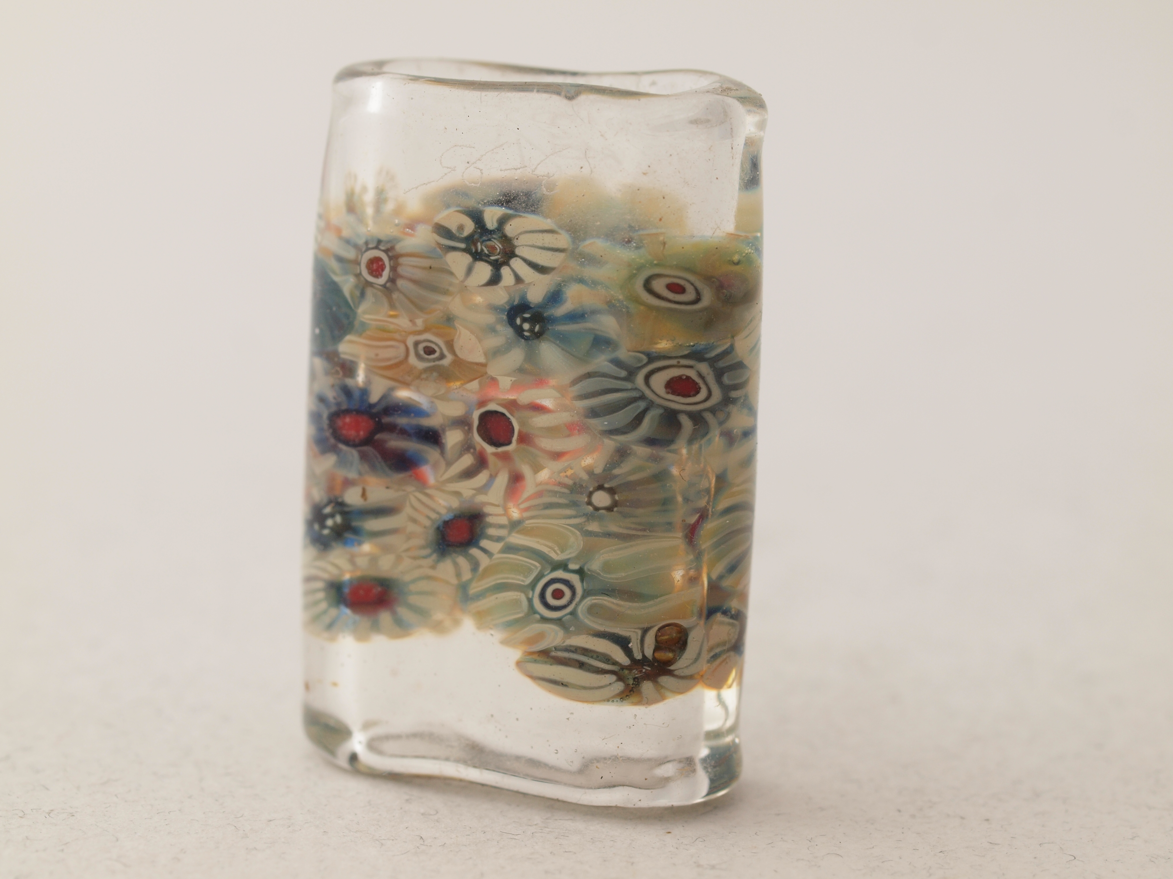 The bead in this post, which he characterized as a scarf clip, features his own murrini—in 1995, there wasn't much of a selection of boro color, let alone cane. He demonstrated the bead for us, and what I principly recall was his taking two graphite rods which he inserted into the tube and then rotated around each other to flatten the shape (after spending a tediously long time in comparison melting in the murrini). I'm pretty sure I bought this bead some time after I started making beads myself, most likely at the GLBG Bead Bonanza. As I recall I paid $60, and it was the most expensive bead to date I'd purchased: it joined the collection early, 1996–1998, perhaps.
