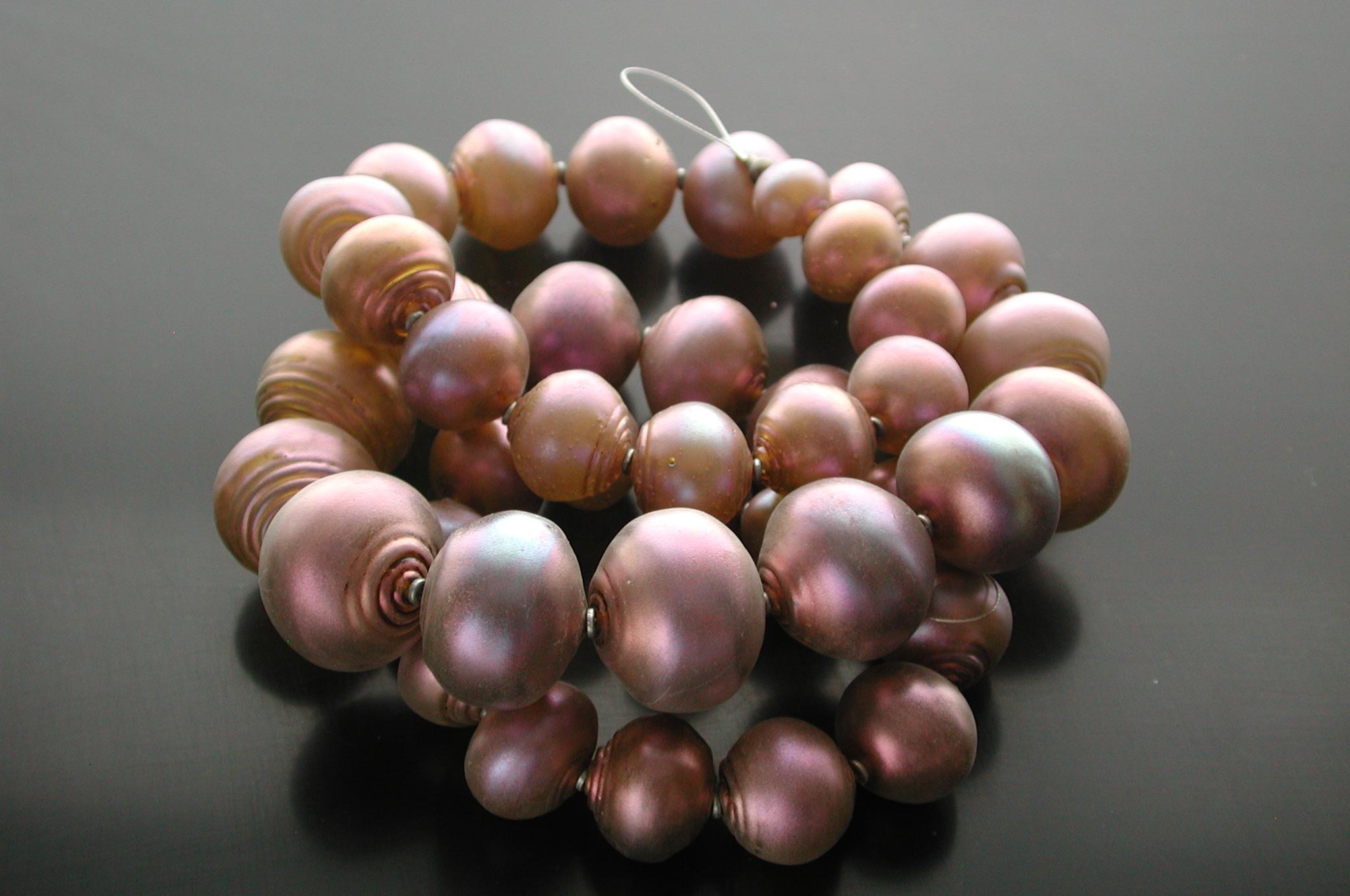 What I offered to make in exchange was a string of “Tiffany favrile style glass” beads using a pixie dust coating. The collector who wanted them seemed very inclined to give me a lot of latitude—plenty of time to make them, and “no stress”, which I interpreted to mean to follow my artistic impulses, as opposed to rigidly following the original specifications.