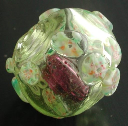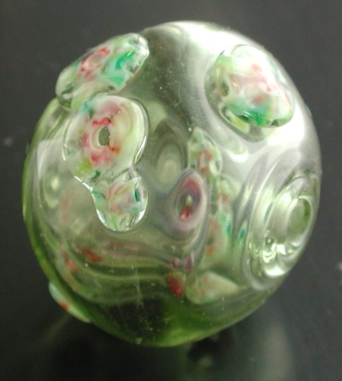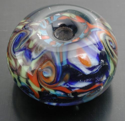 Life is never simple. Although the exchange co-ordinator received the above bead without any problems, when she re-shipped to the ultimate recipient, the rotten thing broken, and all poor Tamara Knight received was a pile of shards. Deanna Griffin Dove informed me of this problem, and I said I would make another one, which I did. In fact, this time I thought it might be nice to make one for myself, so I did that too. And after looking at my marble kaleidoscope again, I decided to try and capture its colors more accurately, and made another, more airy cane with ruby, orange, white, and green. Still considerably chastened from my prior efforts, this was a simple cane.