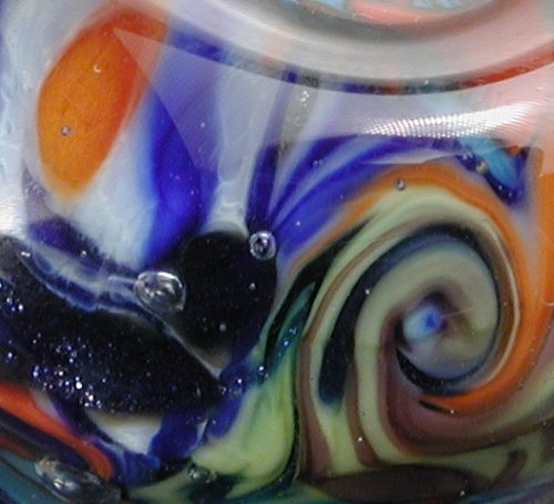 Get a load of that beautifully dimpled hole—just lovely. The artist notes (in shiny silver ink, no less!) that this bead is “Moretti transp[arent] blue core with lots of twisties, ribbon cane & goldstone added & twisted w[ith] a cold stringer randomly. Encased in Lauscha clear.