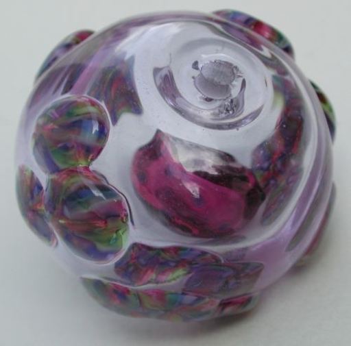 So after making the inner bead and trailing it with blues and greens, I used alexandrite (because it shifts colors, like a kaleidoscope) for the outer bead. After making this outer bead (which obliged me by not sticking to the inner one, thank you), then it was time to apply the murrini, to give the sense of kaleidoscope patterns sprinkled randomly over the surface.