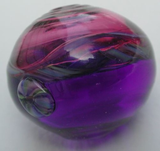 About the smaller bead (a gift to the Exchange co-ordinator): I used a cobalt rod to pull out the complex cane, and of course some was leftover on the end; so I puntied some tourmaline onto that end, and made a hollow bead, making a half sphere till I got to the fancy cane (that is, used up the tourmaline), twisting the cane to make the equator. When I'd laid down all the cane and was down to cobalt, I started the other half of the bead, joining at the cane. Then I applied one of the murrina to it to give it just a bit of a jazz.