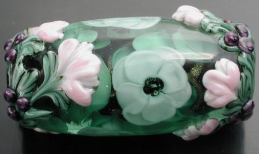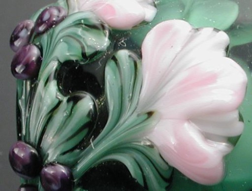 I've included two shots of this fabulous bead I commissioned when I saw a very similar bead in the artist's stash when she came to demo. Unfortunately the last bead she demoed was badly out of focus; so I show this one, which is same basic design, but different colors, to give a better idea of the demo.
