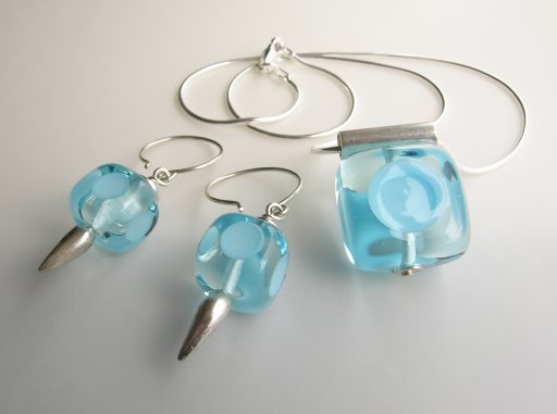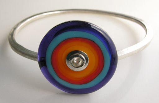 Soft glass, sterling silver, lampworked, fabricated. Copyright 2005 Kristin Perkins; all rights reserved. Coolpix8400, 1/42sec, f5/7, +0.7 exp. bias (not quite enough—I had to lighten using GIMP) with a 500w tungsten photoflood, used with camera's settable white balance.