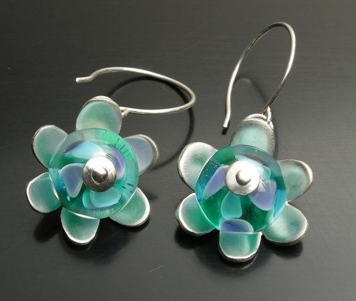 Earrings: silver, soda-lime glass. Mandrel wound beads, fabricated and braised. Copyright 2005 Kristin Perkins. All rights reserved.