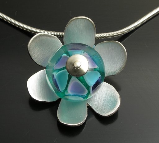 Pendant: soda-lime glass, sterling silver. Mandrel wound bead, sawn, riveted and braised. Roughly 1” (25mm) in diameter. Copyright 2005 Kristin Perkins. All rights reserved.