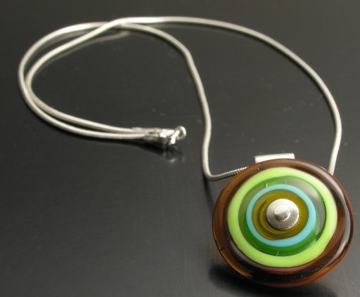 Kristin Perkins continue to explore the subtle interplay between tranparent and opaque sodalime glasses in her autumn themed pendant style necklace. She notes that she's ramping up the color bands: whereas she used to only incorporate three, she can now double that number, as she has here with vetrofond mustard (the avocado), turquoise, emerald?, pea green and a lovely rootbear to finish. You can see for yourself some of the wonderful ways the opaques bounce color into the transparents in the middle green band, which takes on lime qualities from the outer yellow green band, and more bluish ones from the turquoise, to the point that I'm not absolutely certain that transparent is emerald, or grass green.
