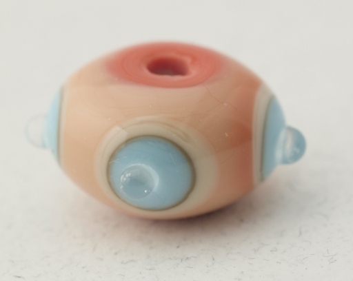 The above is such example. It's not particularly expensive, but I just love the way the background coral color shifts, going from a rich coral to a peachy tint. This was not, the artist told me, something she set out to do, but merely a side effect of the bead's manufacture. Note also how she's taken advantage of another innate property of the glass, the tendency of sulfur to precipitate out of turquoise when next to ivory. This gives her bullseye an extra ring with no added labor on her part, and really, in my opinion, makes the whole design pop.