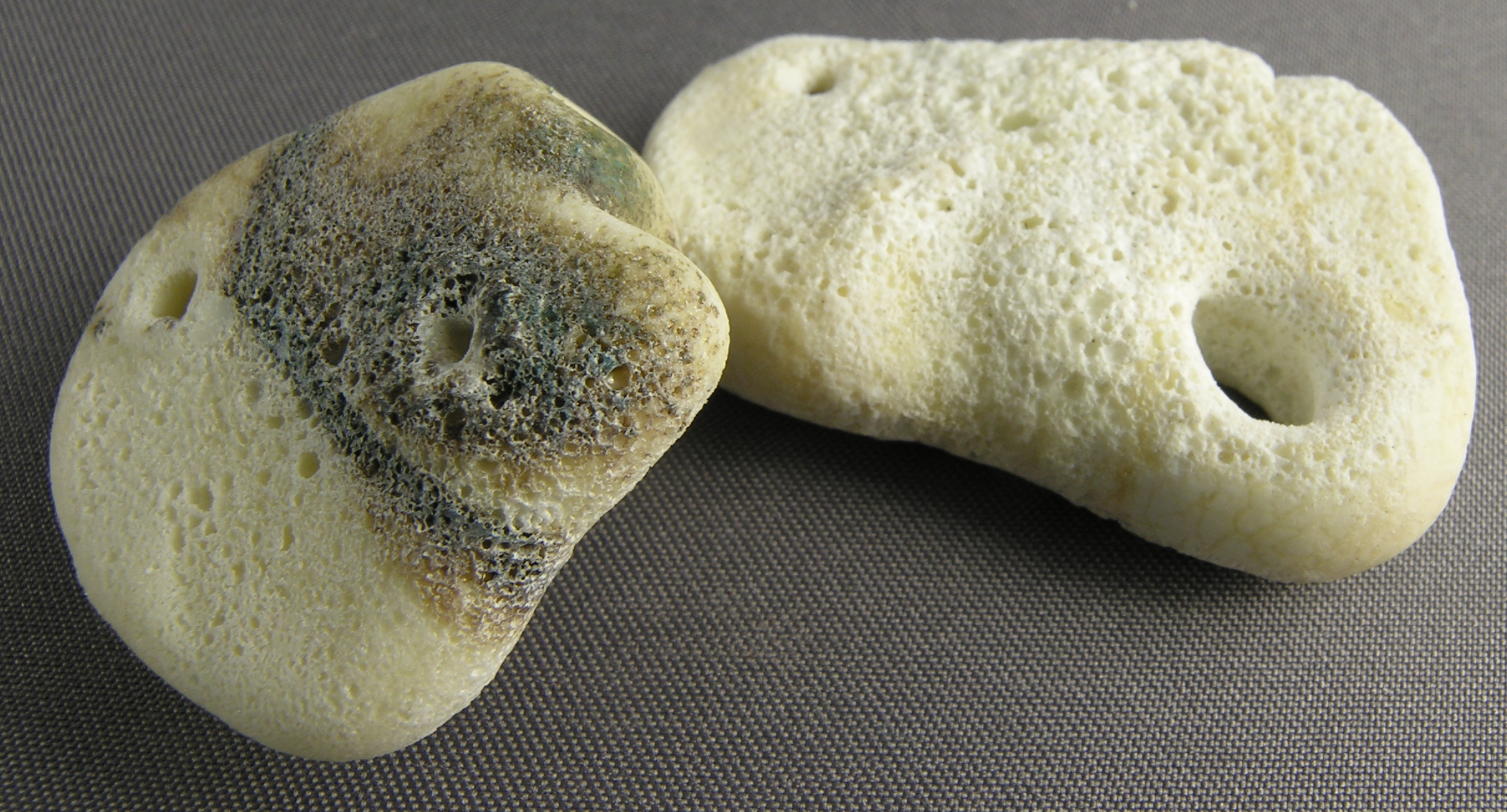 I'm pretty sure these are either effetre or vetrofond, probably light ivory. 2007? Largest is 28x38x10mm, and the hole runs diagonally, more or less corner to corner opposite the piercings. copyright Nita Van Till.