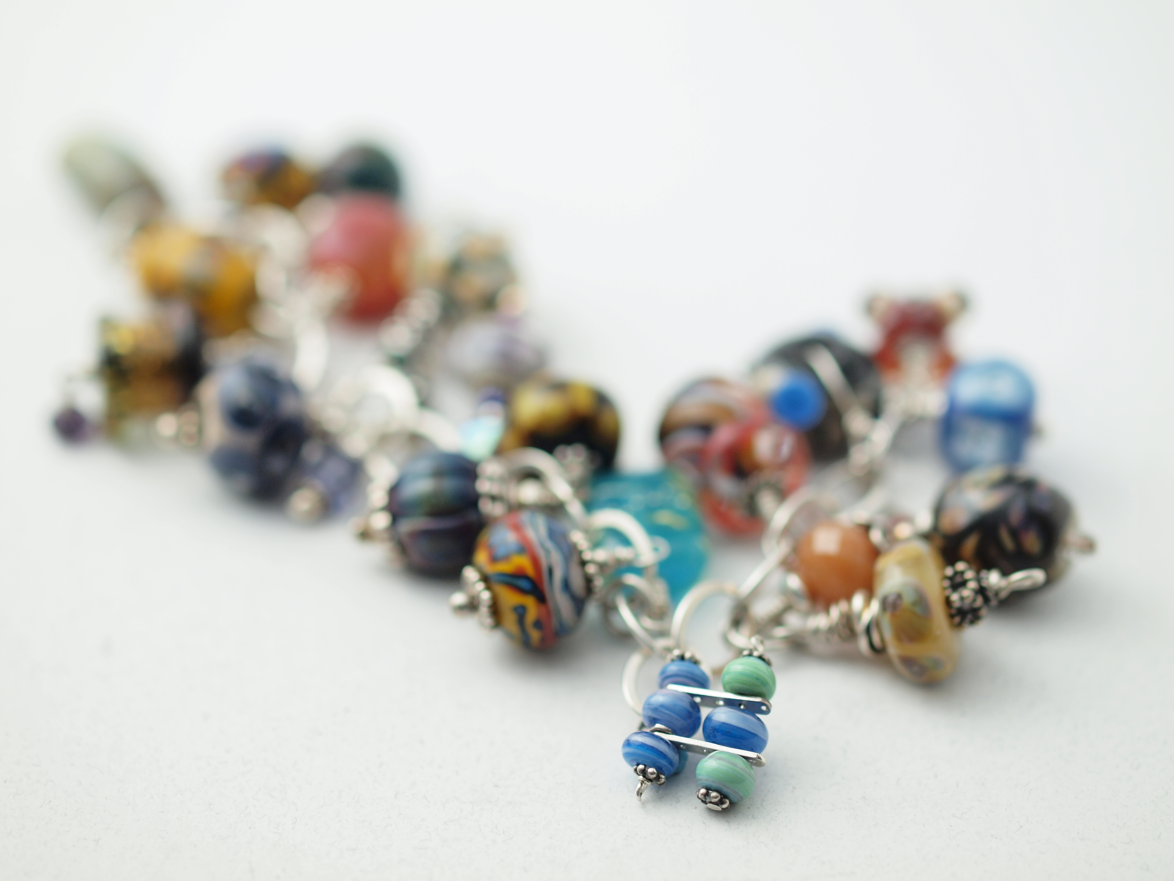 The charm is actually tipped on its side: the u-shaped bail is hiding behind the top center bead, that is to say, the middle left one. (The three blue beads are the ‘top’ of the piece.)