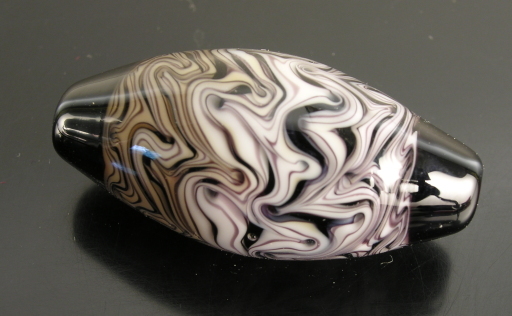 At any rate, her development as a beadmaker has been great fun to watch. One of her interests in simple, clean, curvilinear shapes, often with a bulbous component, contrasted with all-over surface patterns. These raked ‘striped stringer’ beads, such as the one shown below, are a perfect example. My faves, of course, are the ones with orange, lime green and violet. One of my most vivid lampworking memories is Rita demonstrating this bead for me at Unearthed.