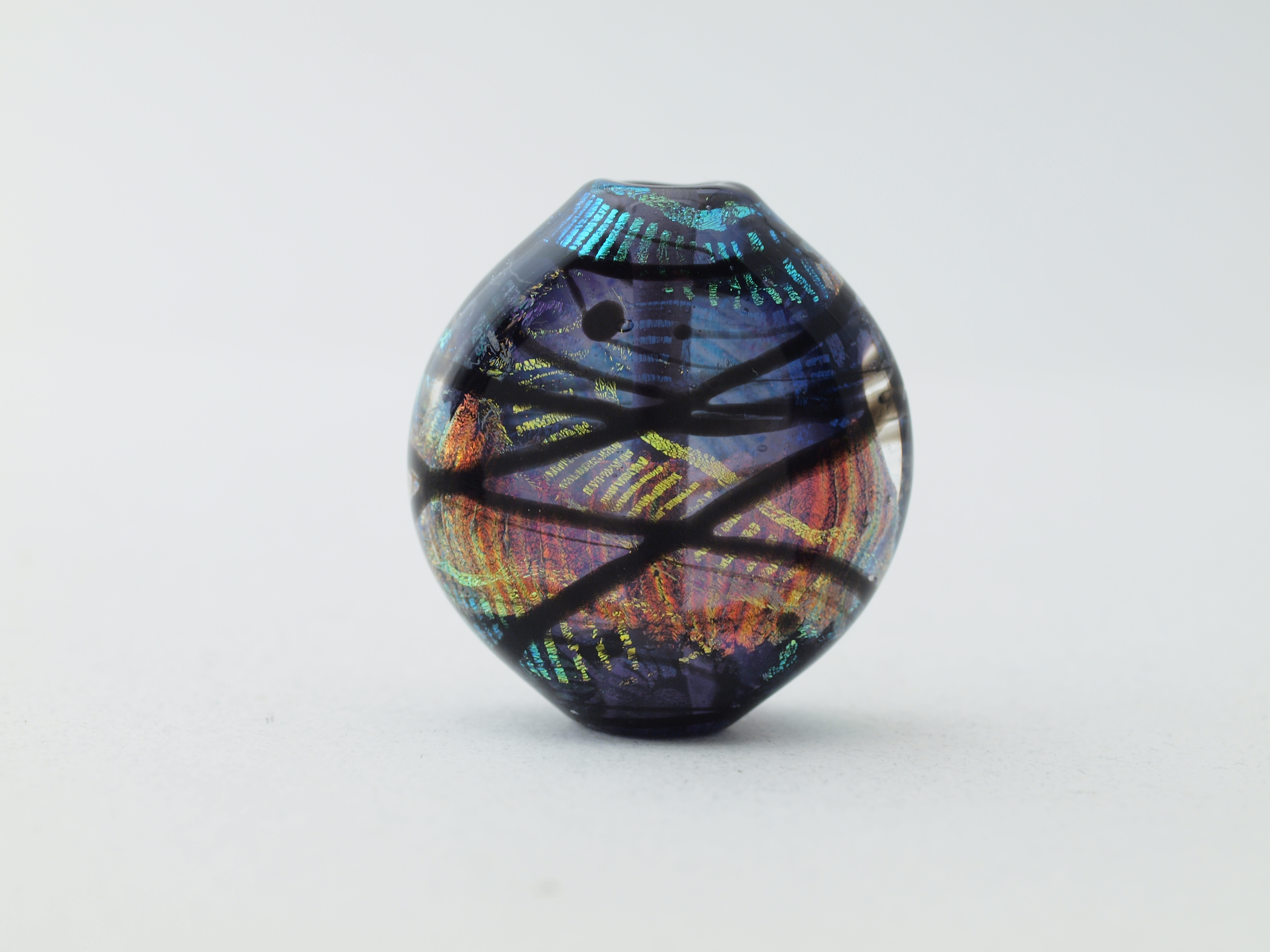 Lisa St Martin is a lampworker specializing in large, glitzy soda-lime beads. She is all about the sparkle: leaf, mica, silver bearing glass and especially dichro: if it's glitters, she's probably tried it:)