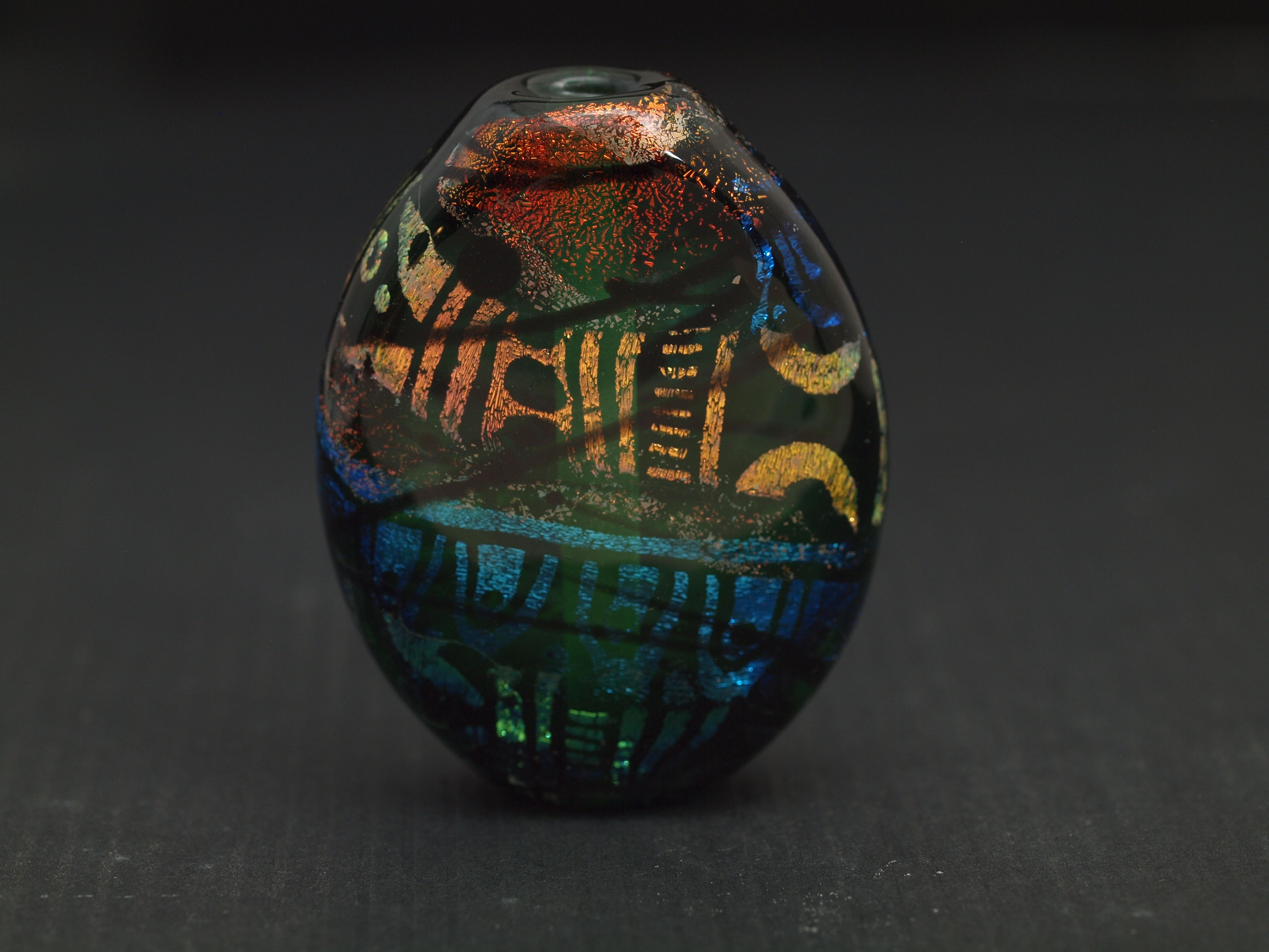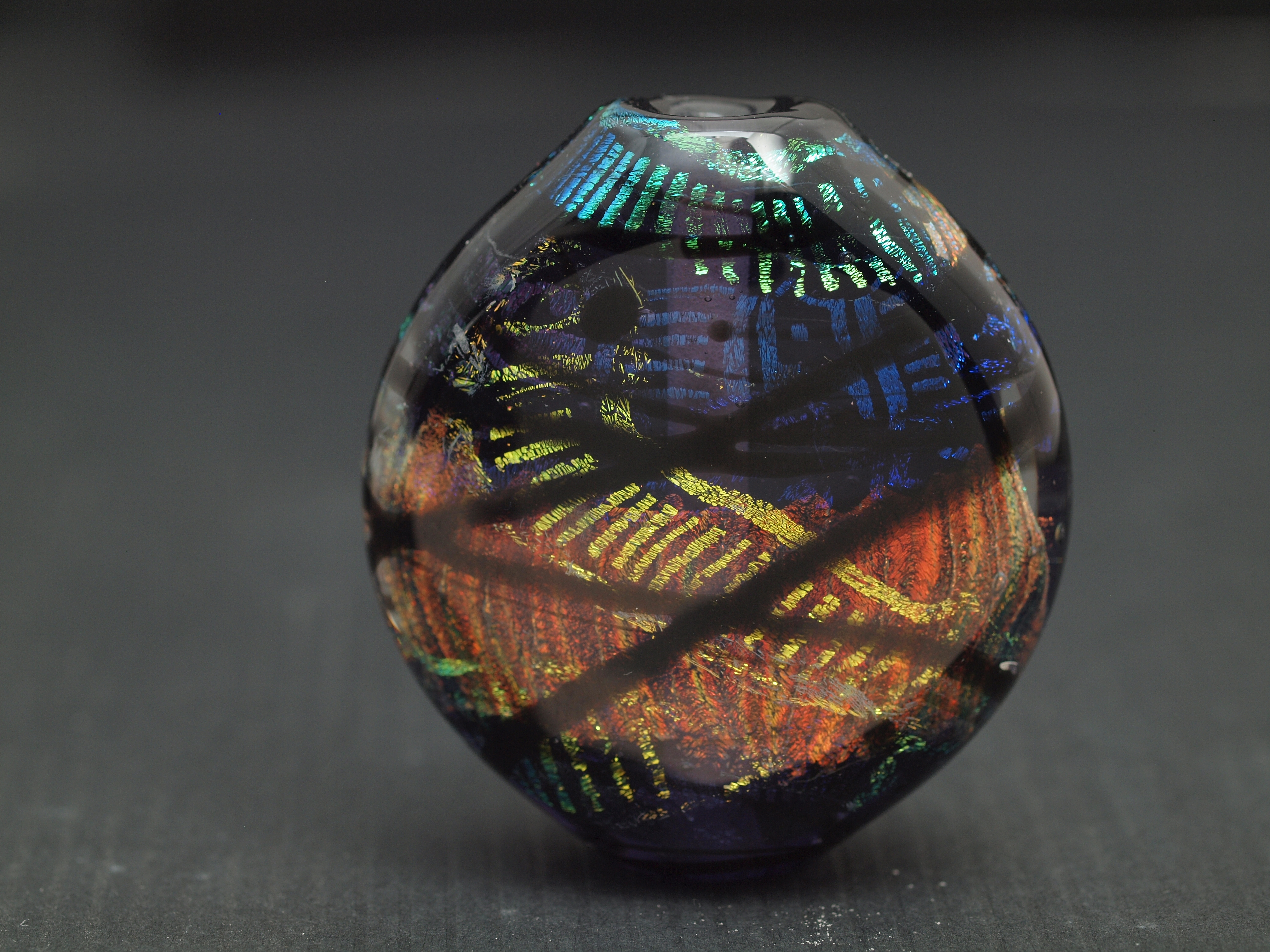I liked the first photo, but the setup is optimized to show off beads in which the reflected and transmitted light are roughly balanced. Although dichroic glass, as the name implies, is manufactured to both transmit and reflect light in beautiful ways, ironically enough, I needed to increase the emphasis on the surface, i.e. reflected, rather than transmitted, light.[4] One way to do this was to change the background to something that would absorb more of the ambient light.