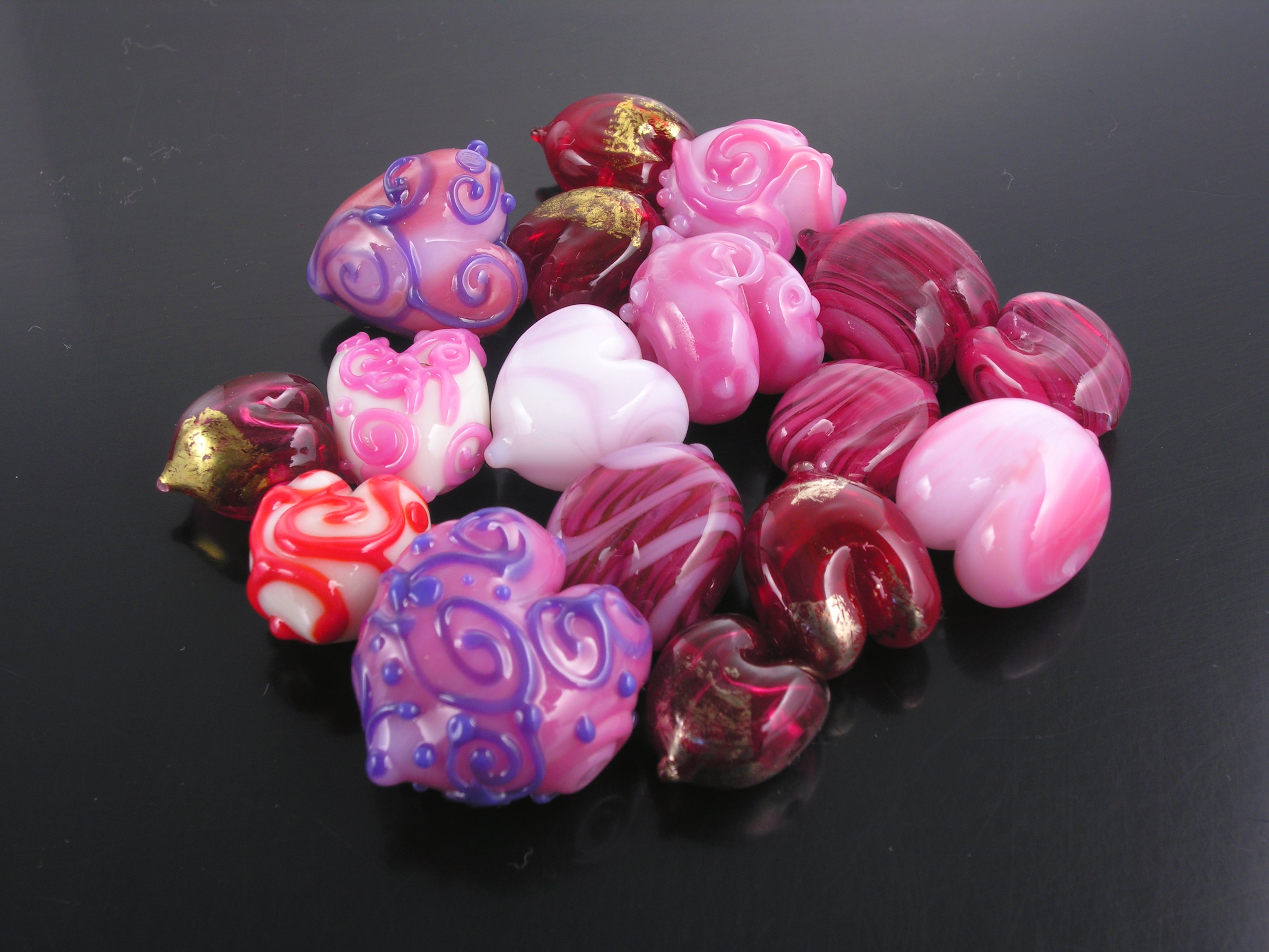 Lampworked hollow hearts, in assorted bullseye, czech and effetre soda-lime glasses, using gravity swirl, scrolling and leaf application techniques.