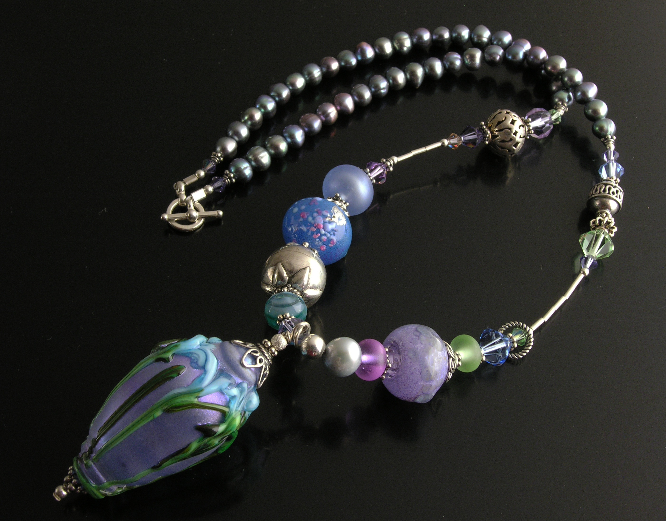 pixie floral vessel necklace, L. Page Brunner, 2007. lampwork, freshwater pearls, bali & sterling silver, swarovski crystal; photographed 25jan2007, nikon 8400 f/7.9, ev -1.0, 1/4s ISO 120, photoflood lighting. cropped & value adjustments in gimp