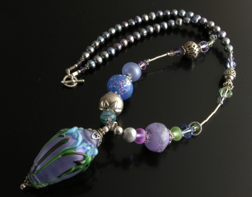 Here's a blast from the past, a single strand violet freshwater pearl necklace, designed and strung by my inimitable partner, Page. It features a pixie dust floral focal (vessel) combined with pixie and abstract round beads, swarovski crystal and czech beads, accented with bali and sterling silver.