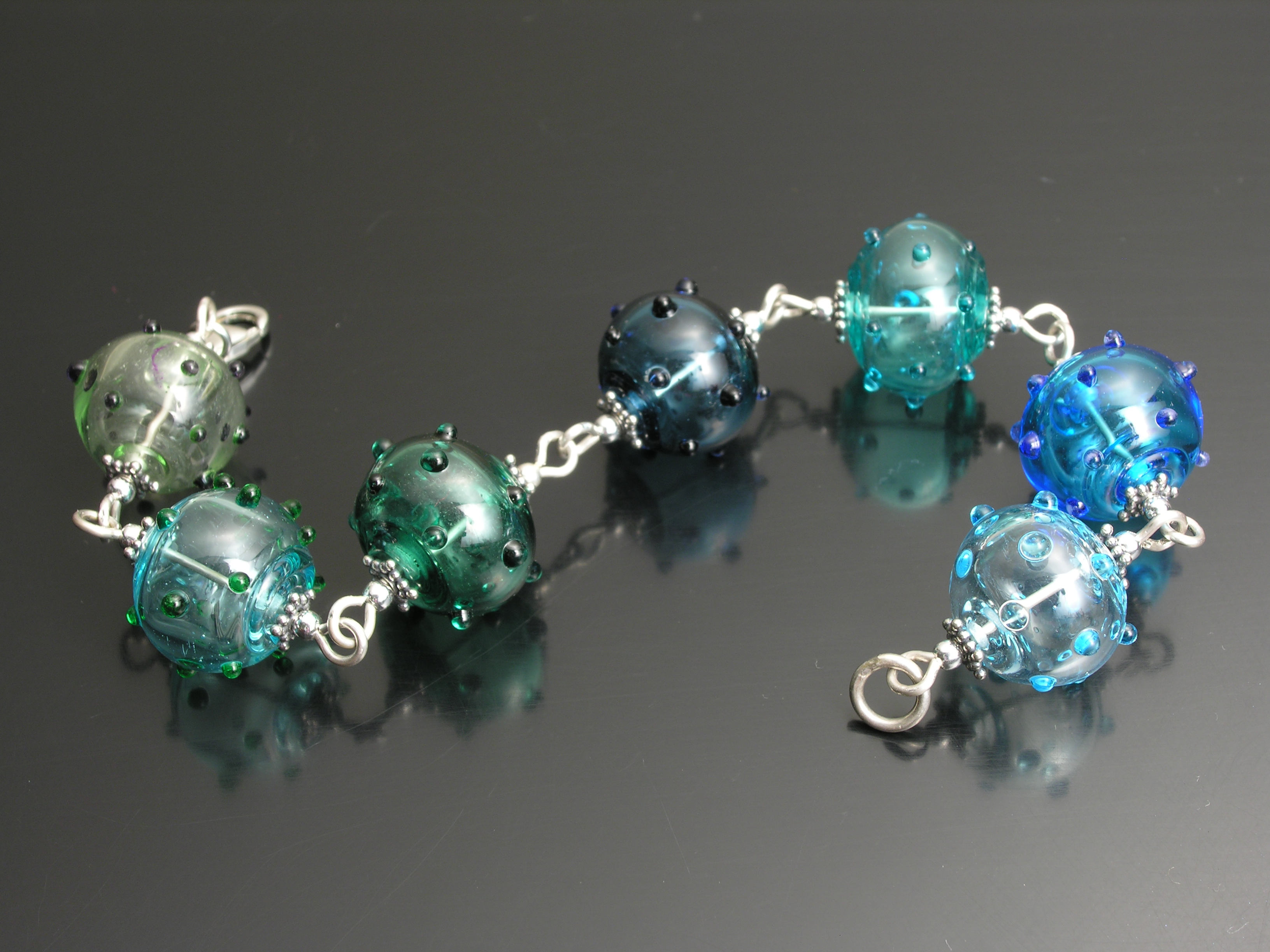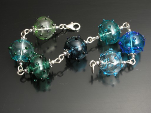 If 2007 wasn't the height of my dottie making skills, it certainly was the year I recorded them the most consistently. This graduated-colour bracelet showcases my friend Page's unerring ability for clean design and her love of cool colours.